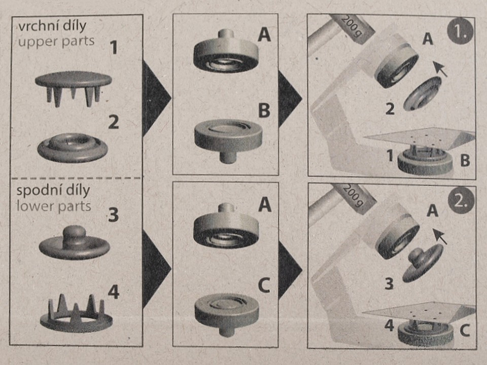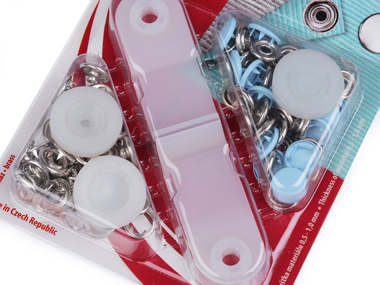 Knoflíky se používají ke spojování jemných a poddajných druhů látek - froté, úplet, košilovina aj. Nýtování se provádí mini lisem, který je součástí balení.