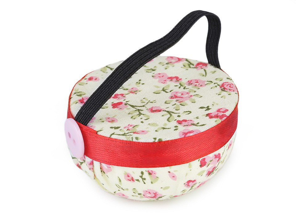 Praktický jehelníček ocení každý, kdo rád šije. Zdobí ho květinový vzor a knoflík. Jehelníček vám díky připevněné praktické pružence usnadní práci - můžete si ho navléct na ruku a jehly se špendlíky budete mít vždy po ruce.