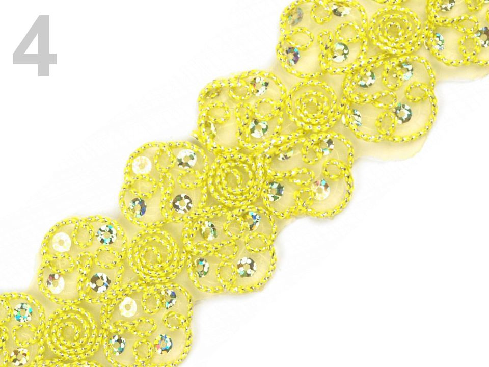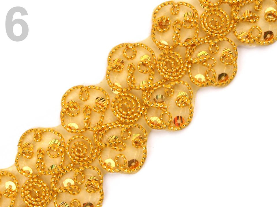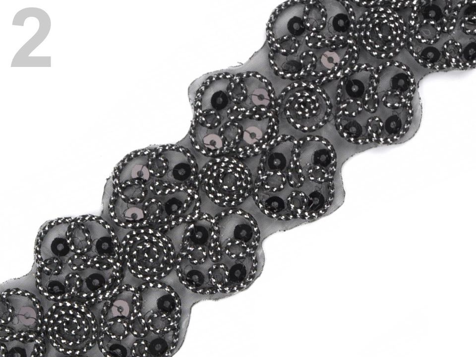 Nažehlovací prýmek je bohatě ornamentálně zdobený flitry a lurexovými šňůrami.
