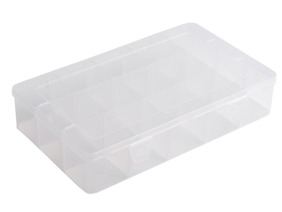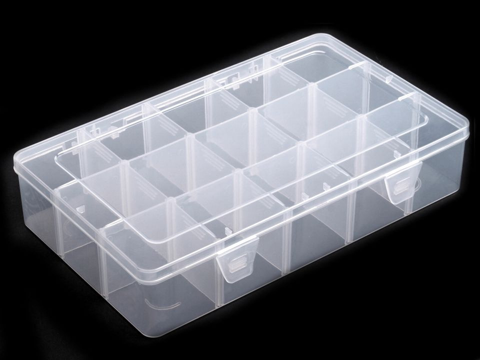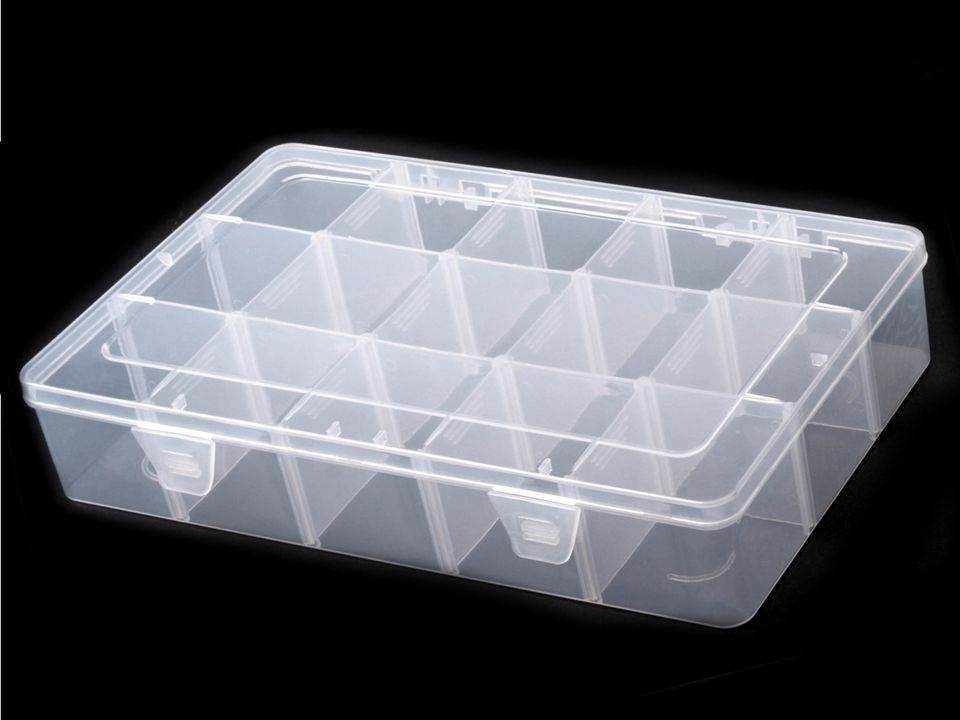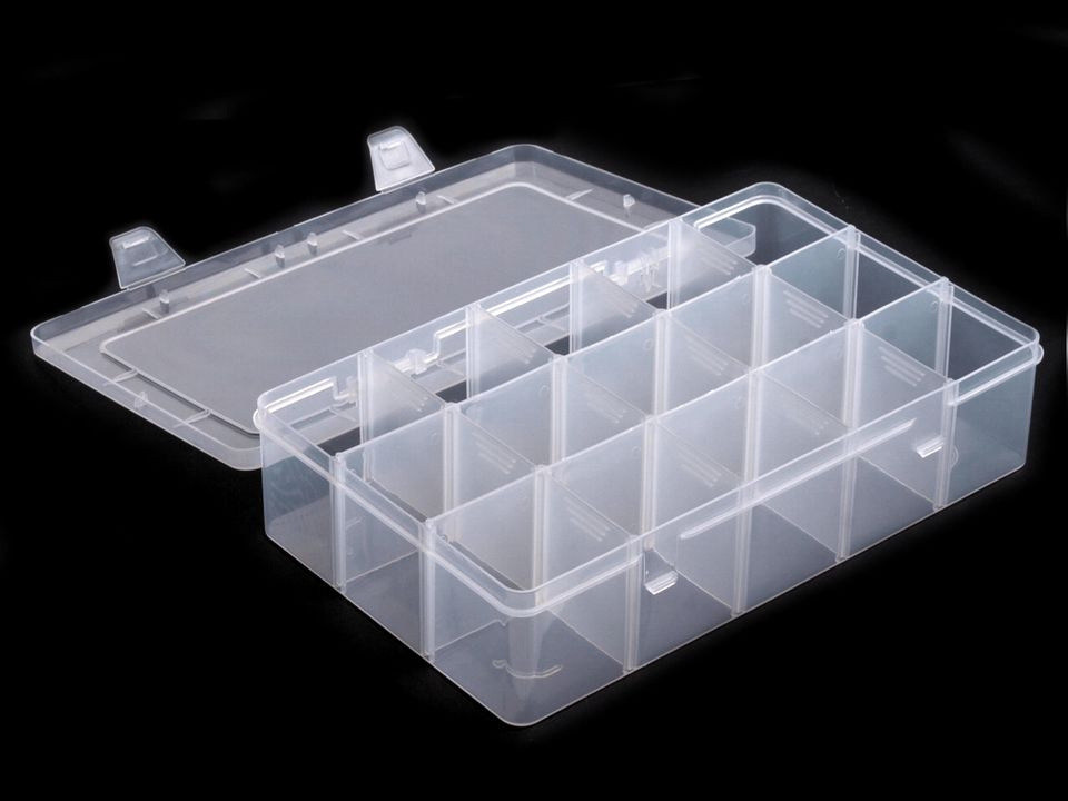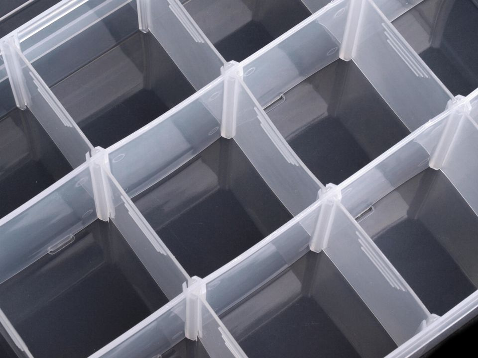 Krabička má 12 přihrádek o velikosti 52 x 52 x 53 mm. Přihrádky si můžete regulovat pomocí odstranitelných přepážek ( 2x dlouhé vcelku, 12 x krátké jednotlivé), pokud odstraníte včechny, budete mít prostor o velikosti 16 x 27 cm.