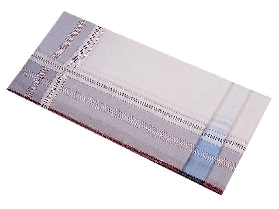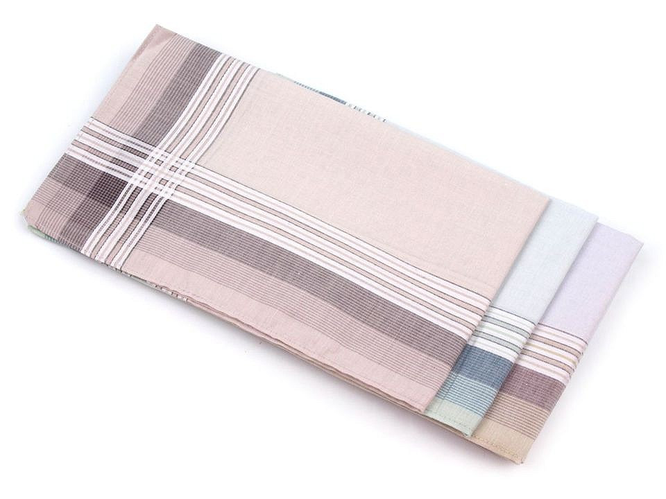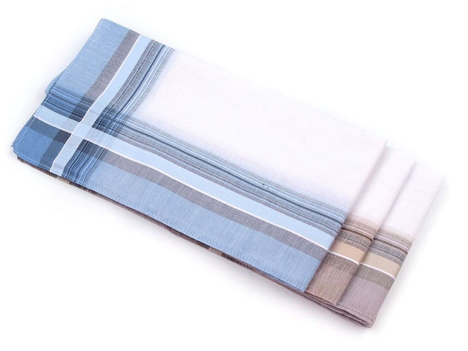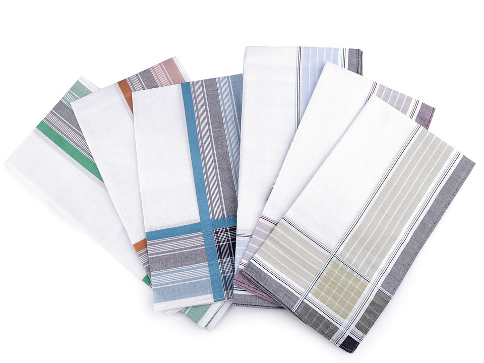 Jedno balení pánských kapesníků obsahuje deset šesti kusových sáčků s bavlněnými kapesníky o rozměru 39,5 cm x 41,5 cm. Kapesník pánský 01102.