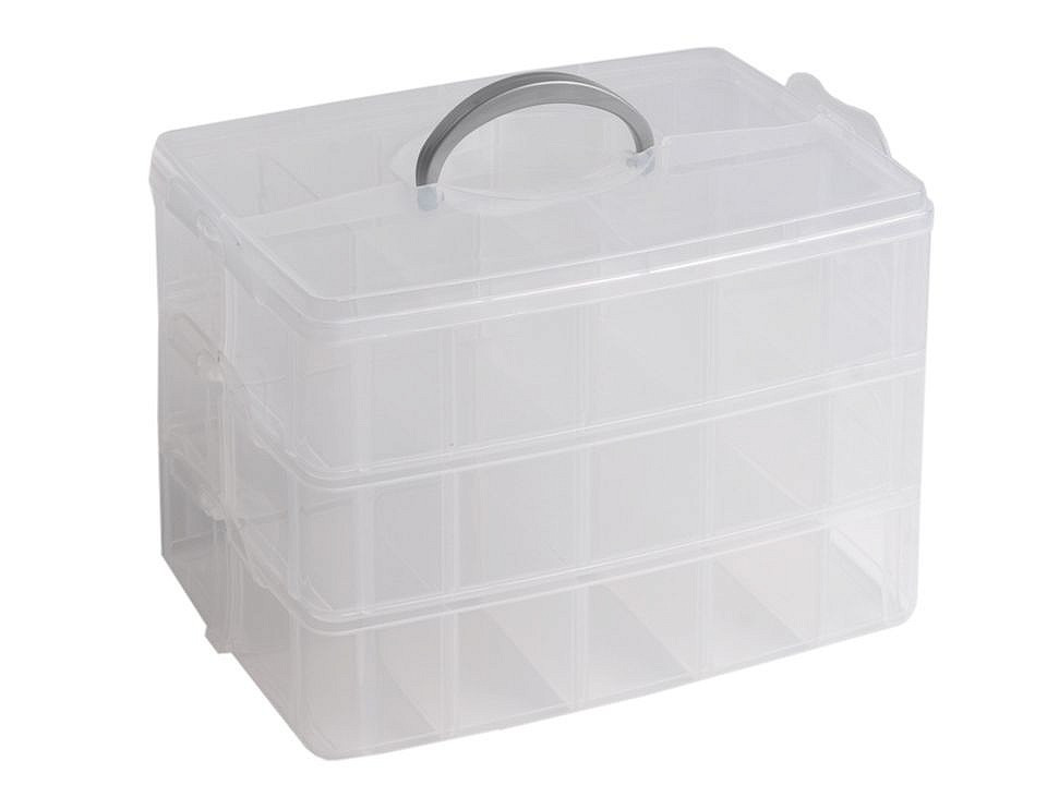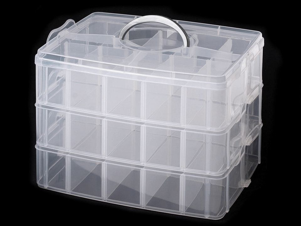 Zásobník má 3 patra. Každý zásobník je víko toho spodního, se kterým se spojí sponou na boku zásobníku. Vrchní dóza má odnímatelné víko, které se rovněž zavírá na sponu. Přihrádky si můžete regulovat pomocí odstranitelných přepážek ( 1 x dlouhá vcelku, 8 x krátké jednotlivé), pokud odstraníte všechny, budete mít jednu přihrádku 16 x 24 cm. Na každém patře je to stejné.