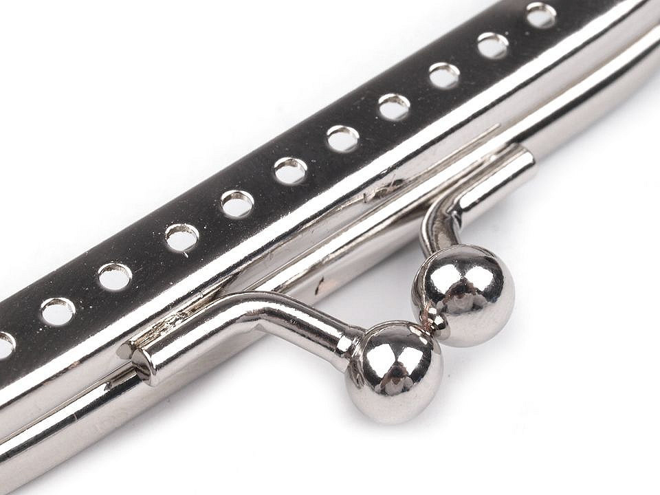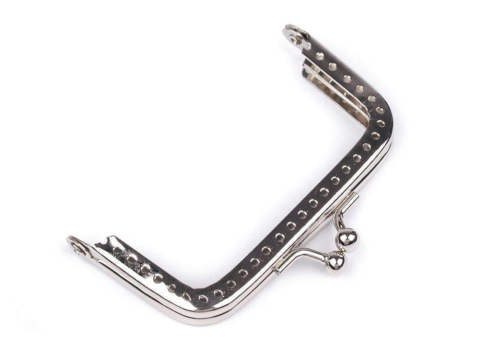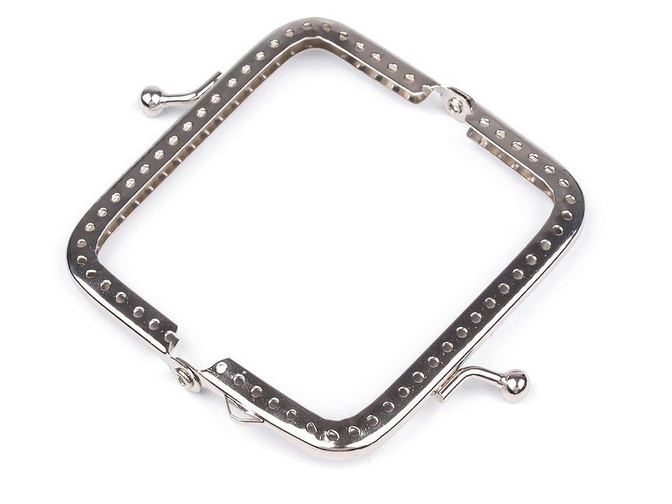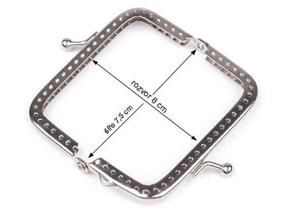 Rámeček se zapínáním na výrobu peněženky. Vnitřní rozměry rozvoru jsou 6 x 7,5 cm, vnější 7,5 x 8 cm. Výška zavřeného rámečku je 4 cm. Rámeček je určený pro našití, kdy se látka dovnitř vloží a ručně přešije přes dírky, jejichž rozpětí je 4 mm. Tento typ zapínání využijete určitě na jakýkoliv typ peněženky. Složení: kov
