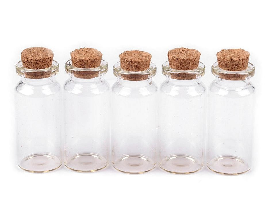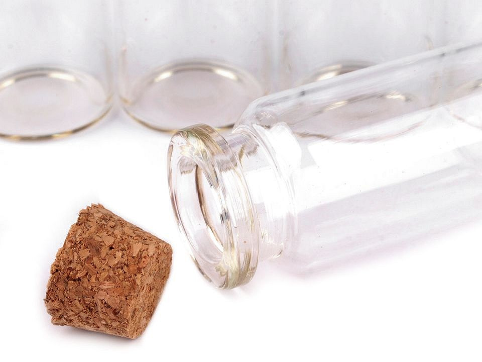 Praktické skleněné lahvičky vhodné na skladování drobných perliček jako je např. rokajl. Díky jejich průhlednosti jsou uskladněné korálky velmi přehledné. Ideální vybavení pro vaší tvořivou dílnu. Korkový uzávěr pevně uzavře obsah dózy.