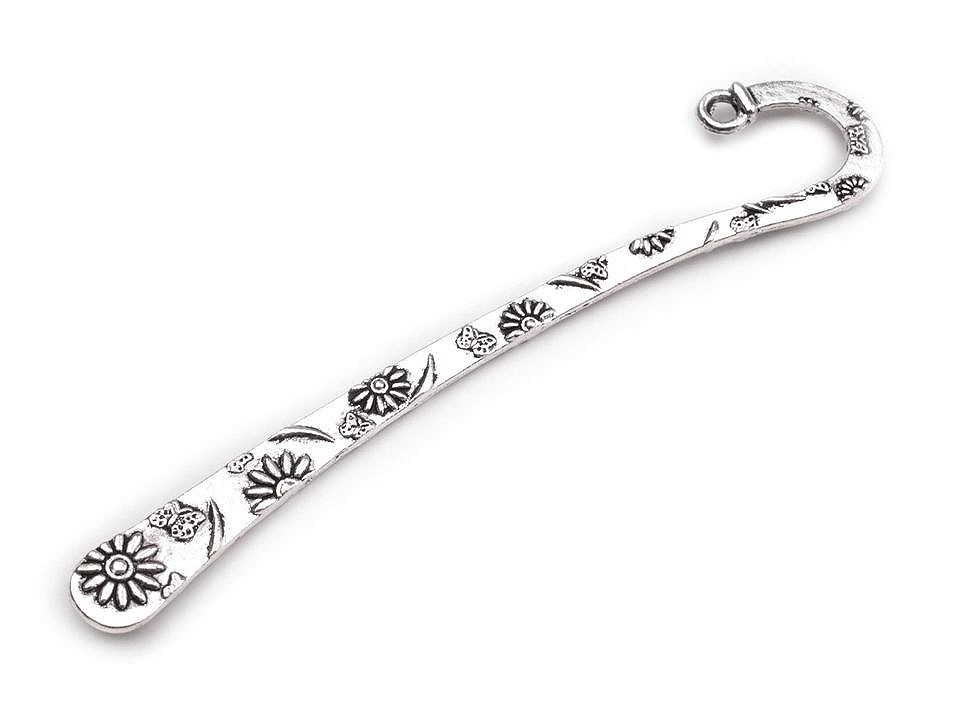 Záložka je zdobená ornamenty květů a motýlů, má lehce prohnutý tvar a kulatý háček, který můžete zavěsit za okraj knihy. Zdobení je oboustranné.