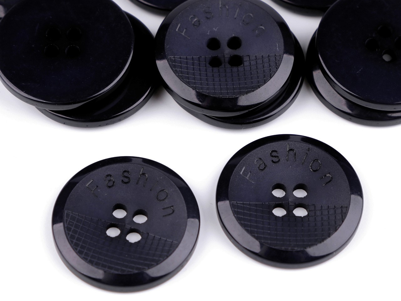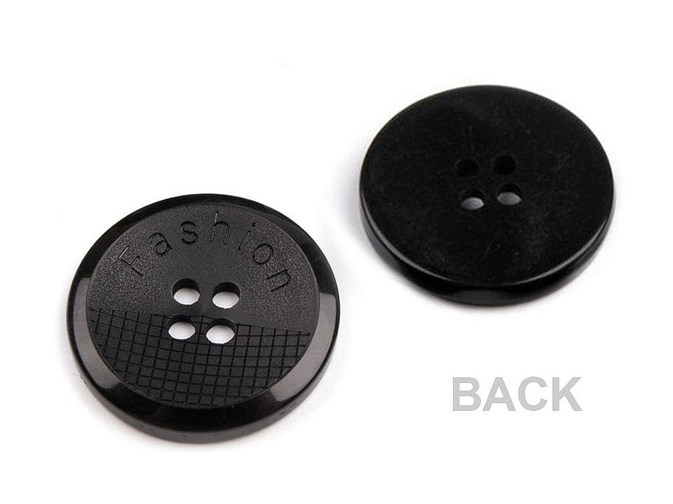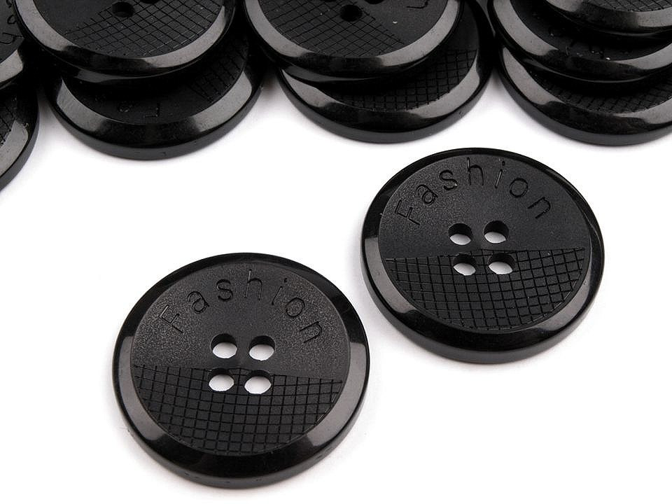 Čtyřdírkové knoflíky zdobí vyrytý nápis "fashion". Jsou vyrobené z plastu. Jejich povrch je matný, pouze okraj se leskne. Knoflíky můžete našít na oděvy, například saka, svetry, bundy apod.