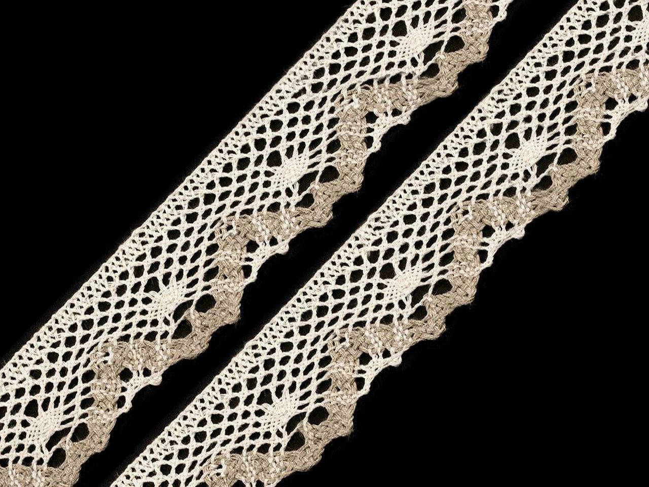 Lněná paličkovaná krajka má zajímavý vzor, na jedné straně je zakončena vlnkami. Krajka je dvoubarevná. Doporučujeme ji žehlit přes tkaninu.