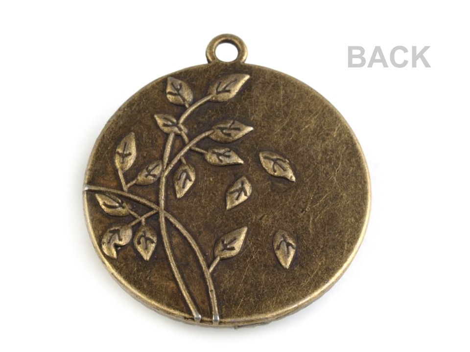 Průhledný kabošon je zasazený v kovovém lůžku. Kabošon má tvar vypouklé čočky. Okraj lůžka je zdobený reliéfy, má barevnou staromosaznou patinu, která působí starobyle. Zadní strana je zdobená drobnými lístky.
