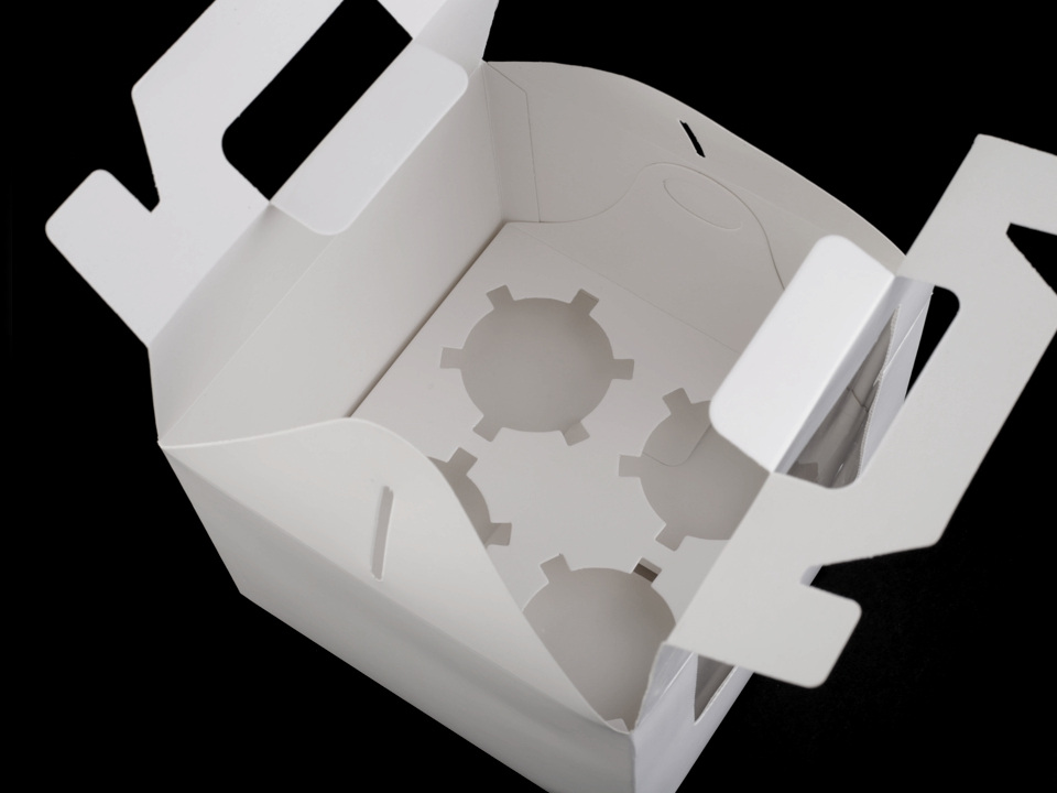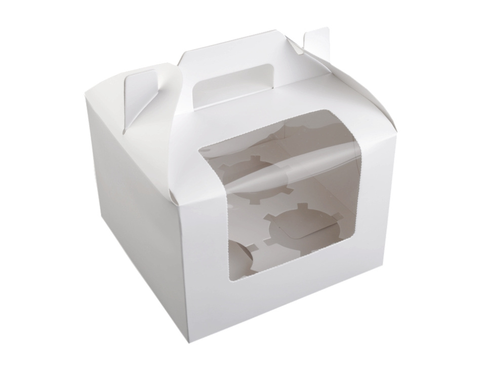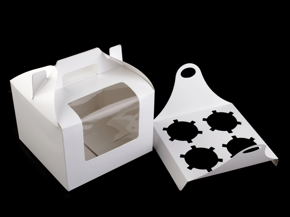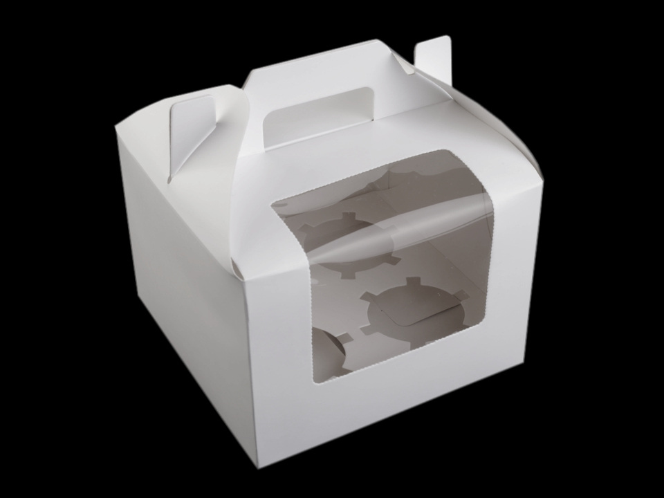 Papírovou krabici využijete na muffiny a cupcakes. Uvnitř je vyjímatelná vložka se 4 otvory na dortíky. Krabičku využijete na svatbě i na oslavách. Má plastový průhled, který vám umožní nakouknout dovnitř. Krabičku si navíc můžete dozdobit dle vlastního vkusu. Lze ji použít i bez vnitřní vložky. V horní části krabičky je ucho na pohodlné nošení.