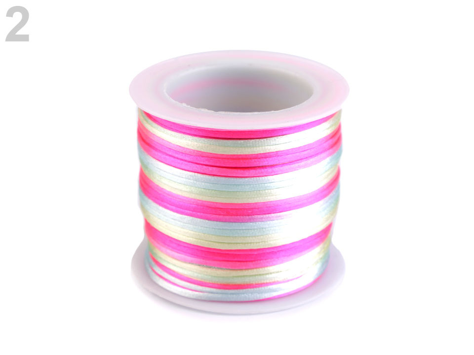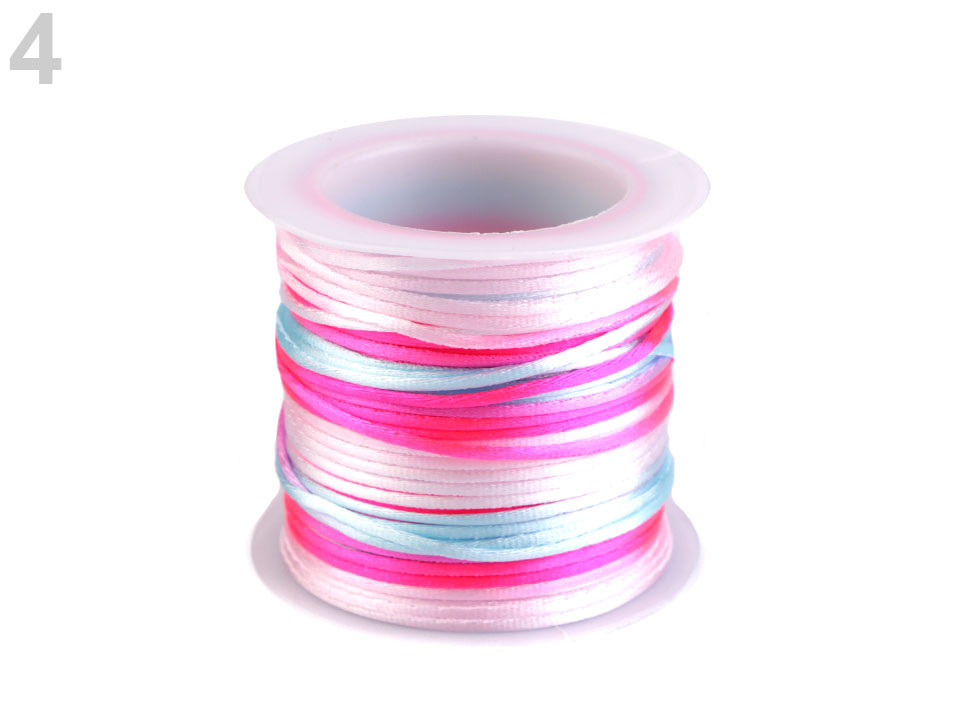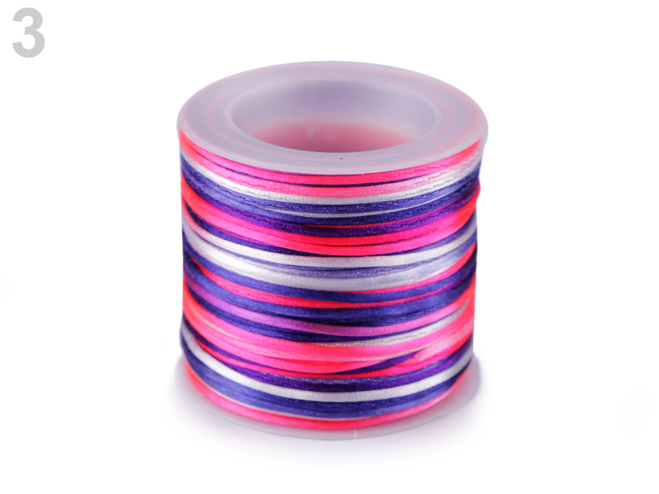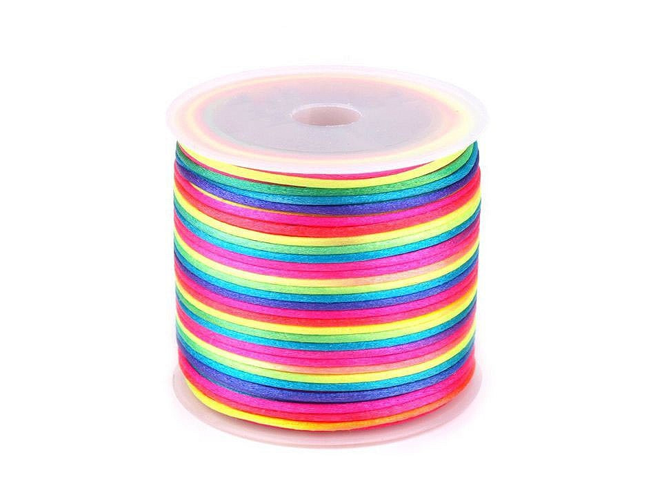 Saténová šňůra působí díky svému duhovému zabarvení vesele a hravě. Přechody mezi barvami jsou plynulé. Šňůra je kvalitní a pevná.