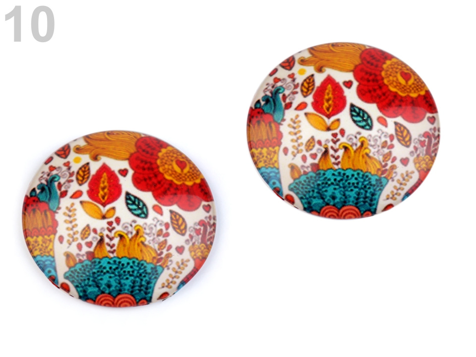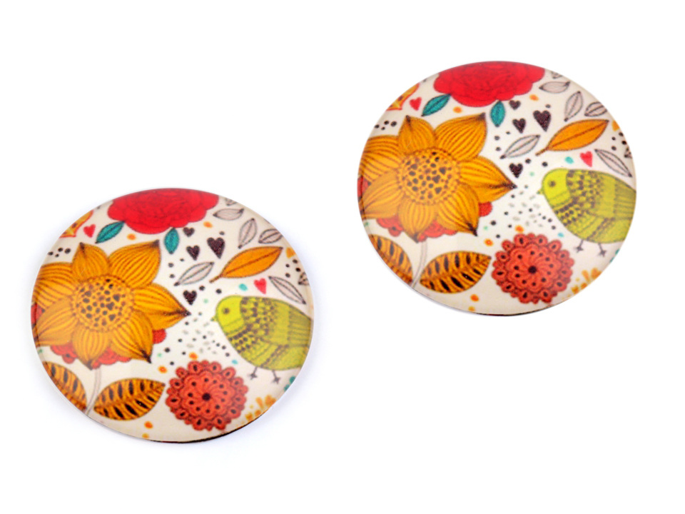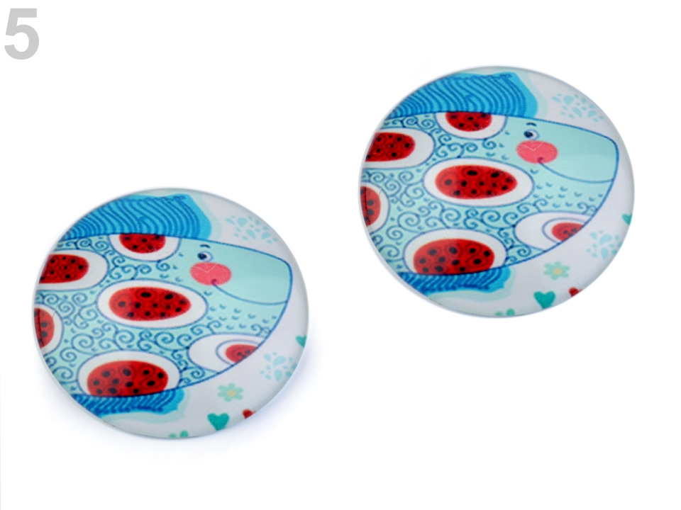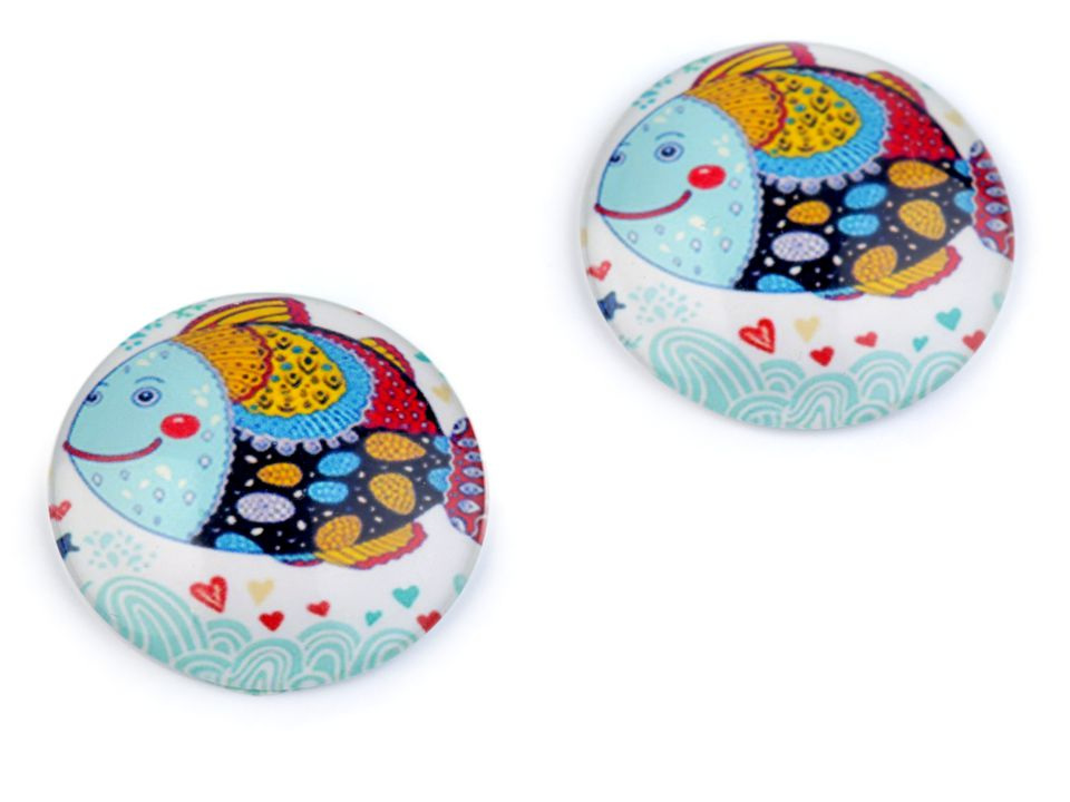 Kulaté skleněné kabošony s mořskými, květinovými a zvířecími motivy.
