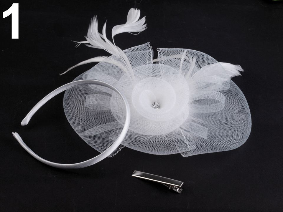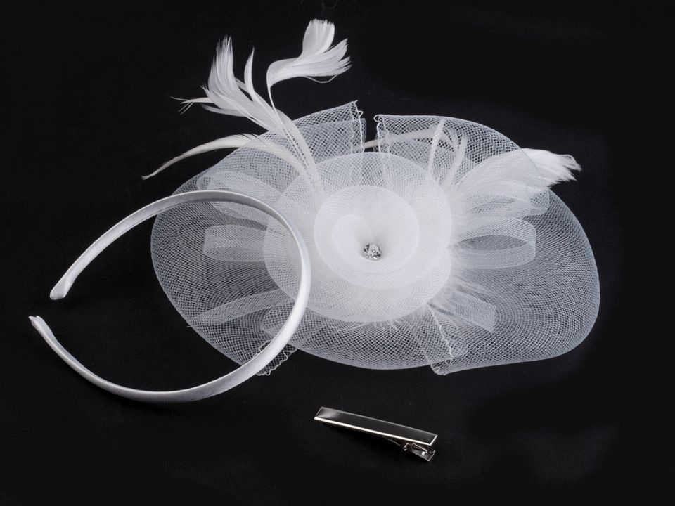 Je vyrobený z modistické síťky, vytvarovaný do podoby květu. Uprostřed je dozdobený lesklým broušeným kamenem. Jedna strana je zkrášlená pírky.
