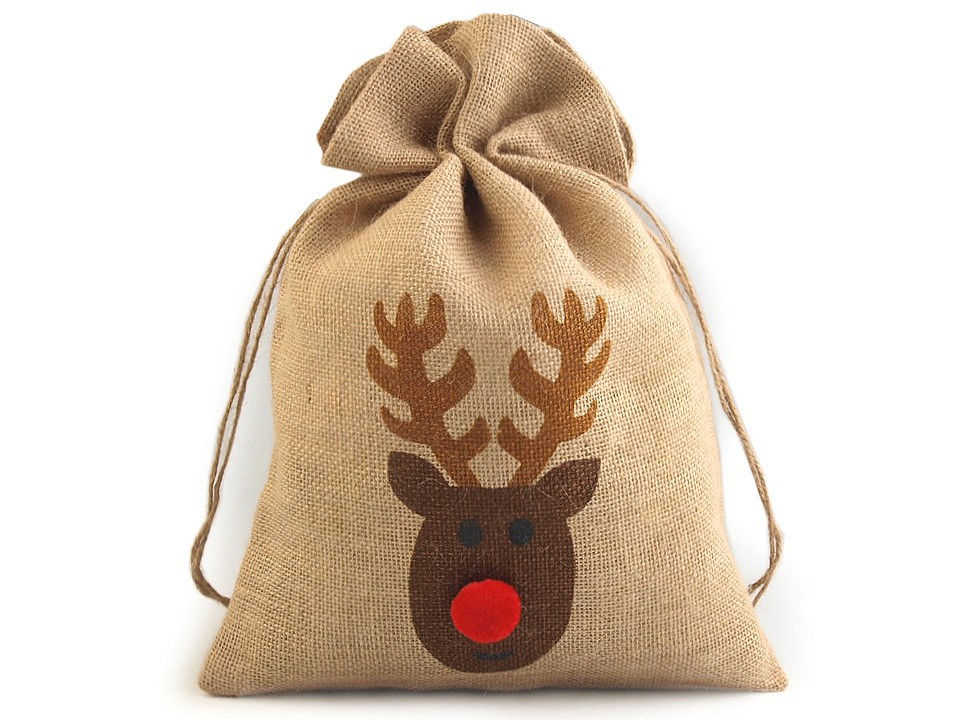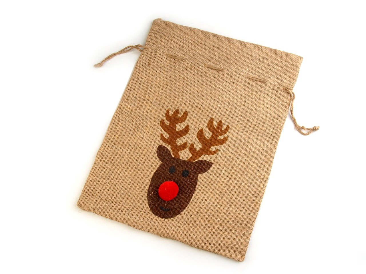 Jutový pytlík se sobem nadchne nejen děti, ale i dospělé. Pytlík zaujme především malbou a bambulkou místo nosu. Stahuje se pomocí jutového provázku.