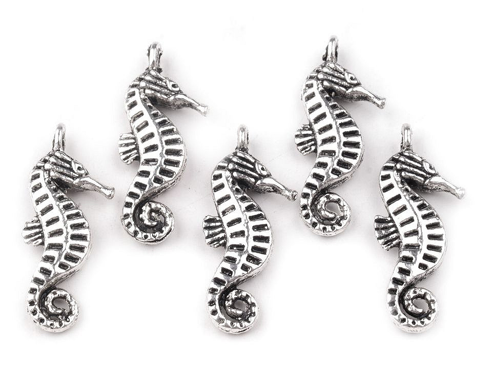 Roztomilý přívěsek mořského koníka využijete do výrobků s mořskou tématikou. Je oboustranný, z nemagnetického kovu. Přívěsek můžete použít k dekoračním účelům. Zajímavě vynikne uvázaný na stužce, kterou se ováže např. svícen, papírové přání nebo dárková krabička. Můžete si jím ozdobit např. klíče. Je vhodný k tvorbě ketlovaných záložek do knih nebo ozdobných přívěsků na kabelky na karabinky.