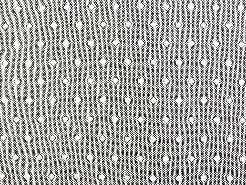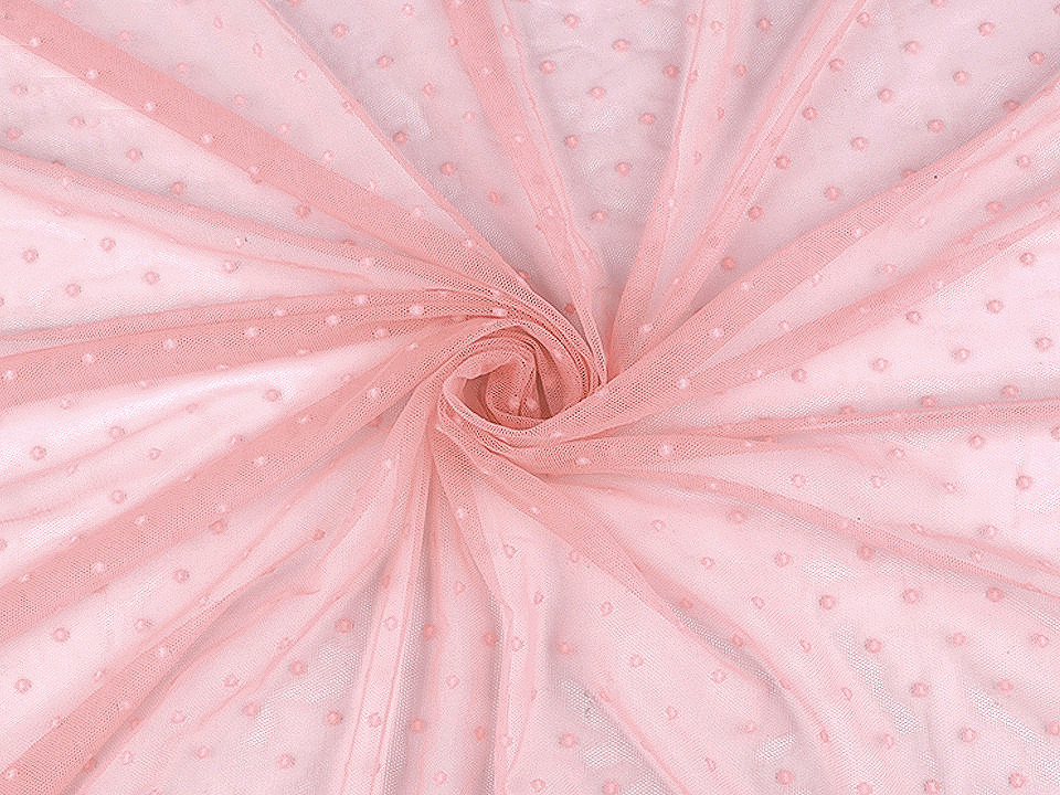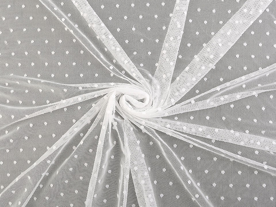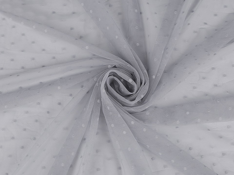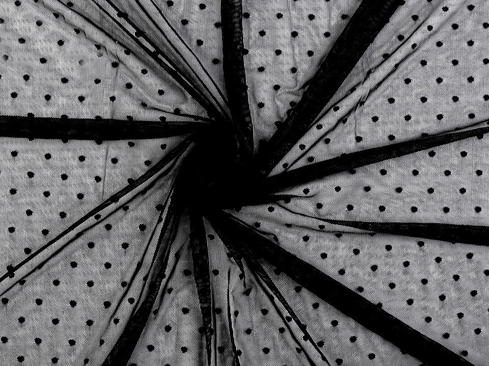 Elastický tyl s puntíky je jemný a splývavý. Používá se k našití na oděvy jako vsadka nebo ozdobný prvek na rukávy, na šaty, halenky, sukně, apod.