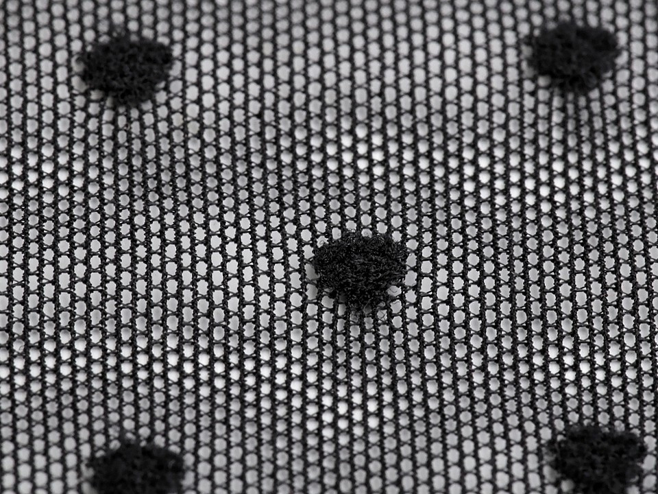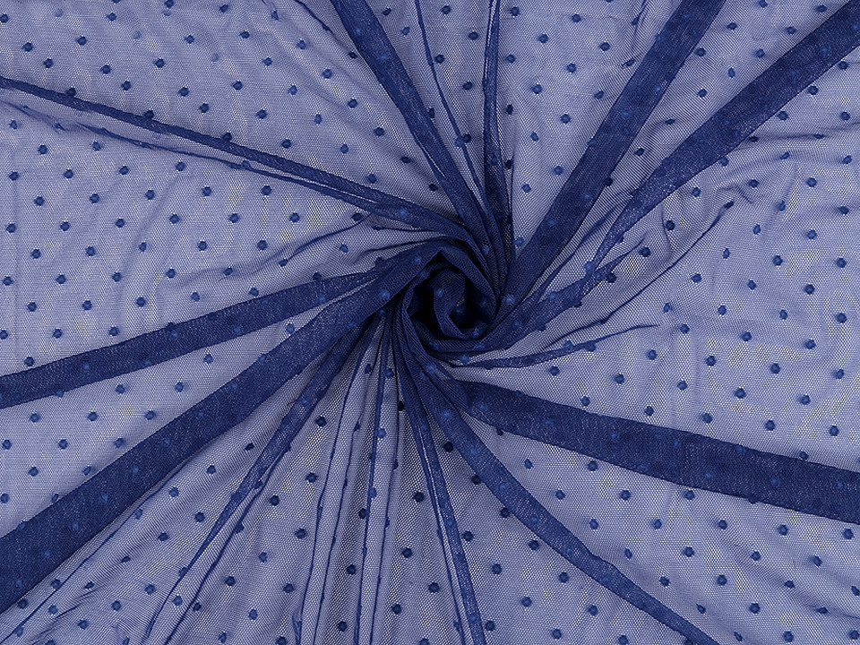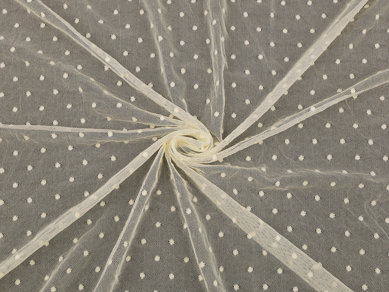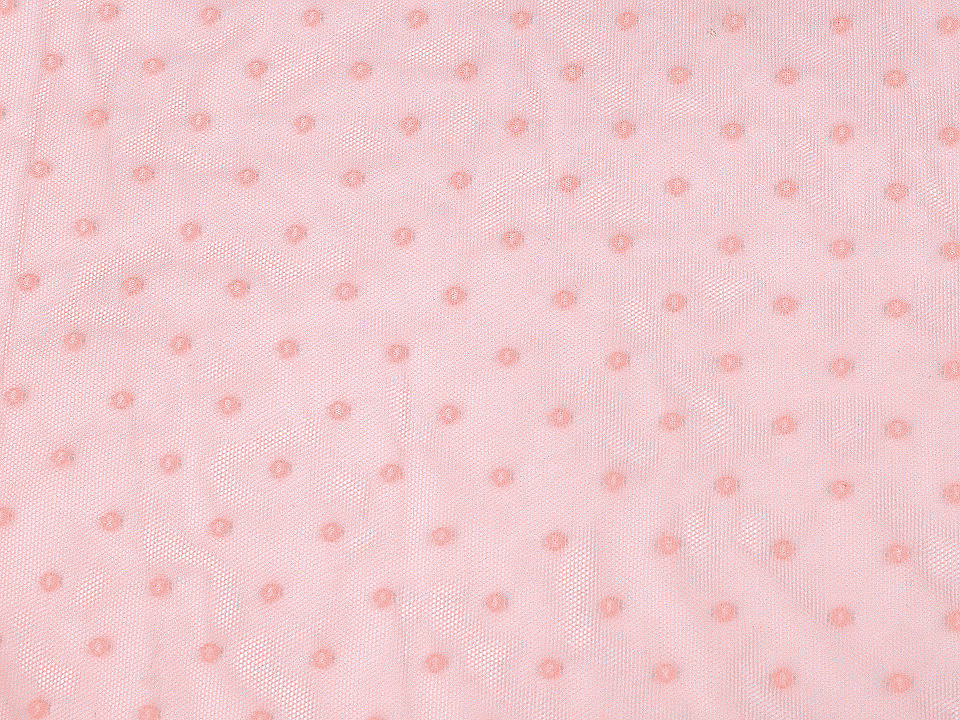 Elastický tyl s puntíky je jemný a splývavý. Používá se k našití na oděvy jako vsadka nebo ozdobný prvek na rukávy, na šaty, halenky, sukně, apod.