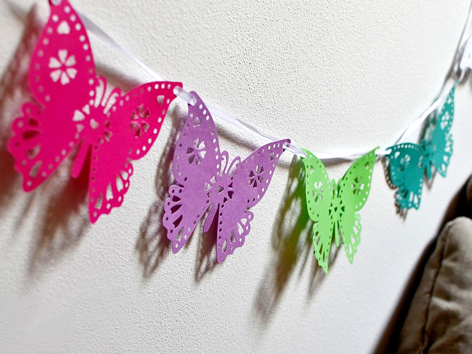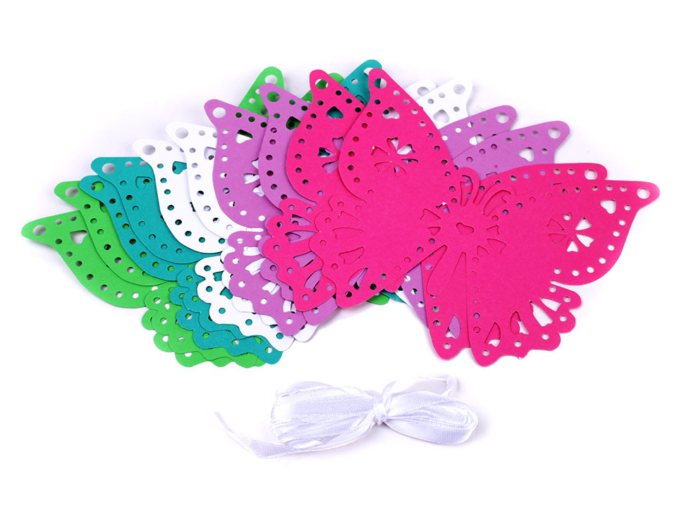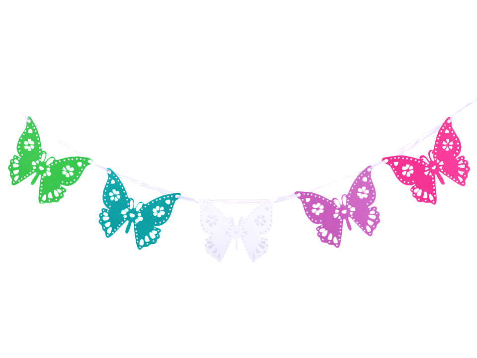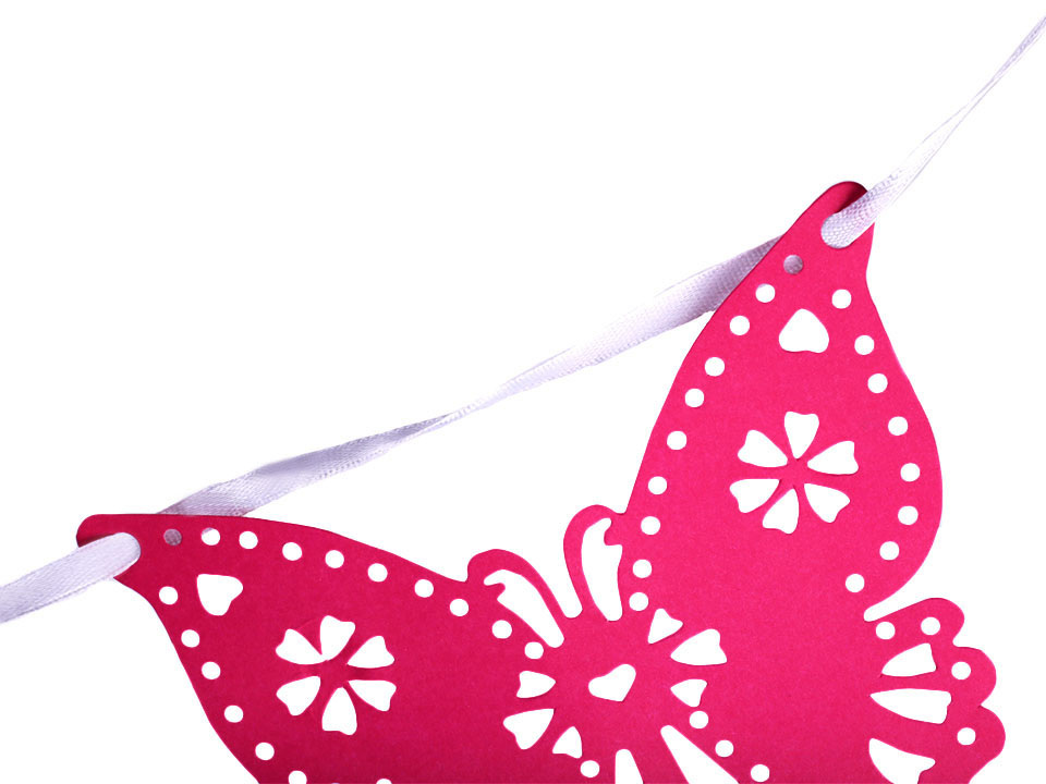 Girlandu s motýly si oblíbí malé i větší princezny. Můžou ji využít nejen na narozeninové oslavy a párty, ale také jako výzdobu pokojíčku. Součástí balení je saténová stuha, kterou provlečete dírkami na motýlech.