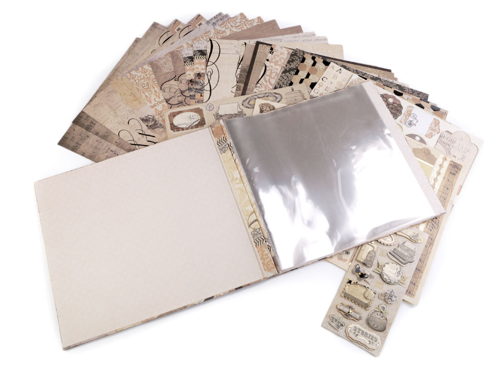1 album (31,5 x 35 cm), tvrdá vazba, listy z průhledné folie 15 ks (30 x 30,5 cm), jsou pevně vsazené, povrch alba je zdobený