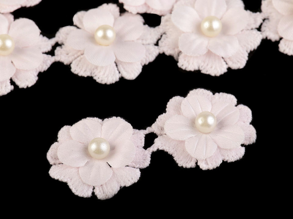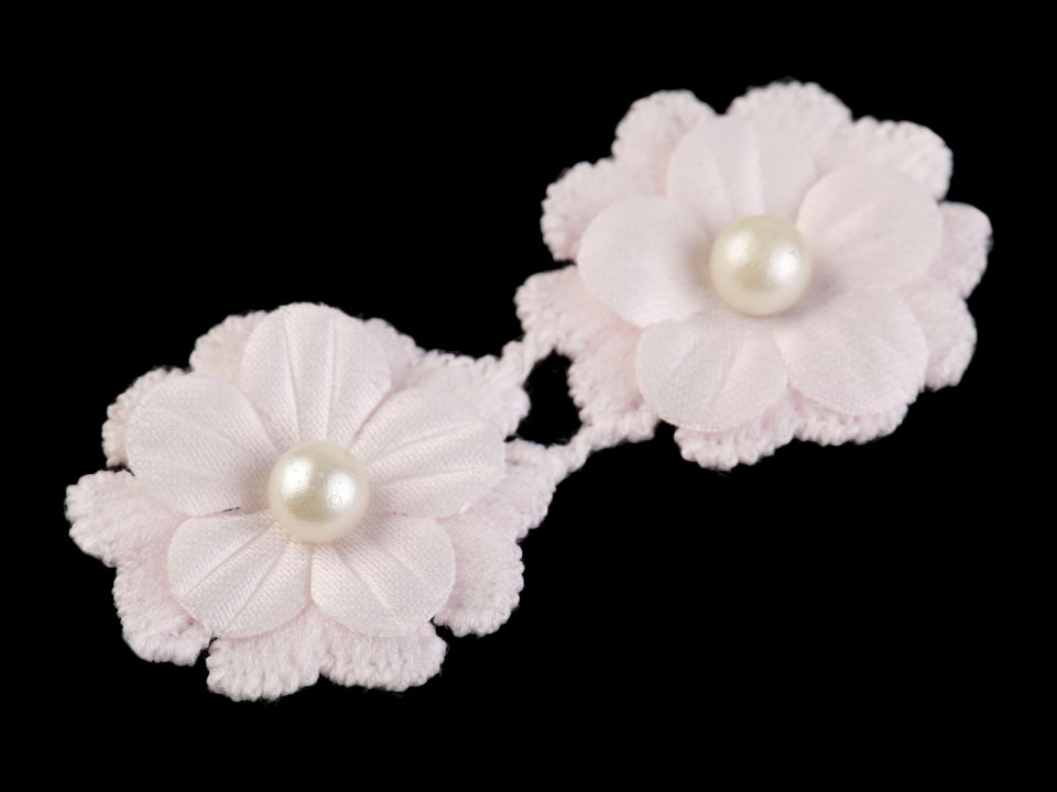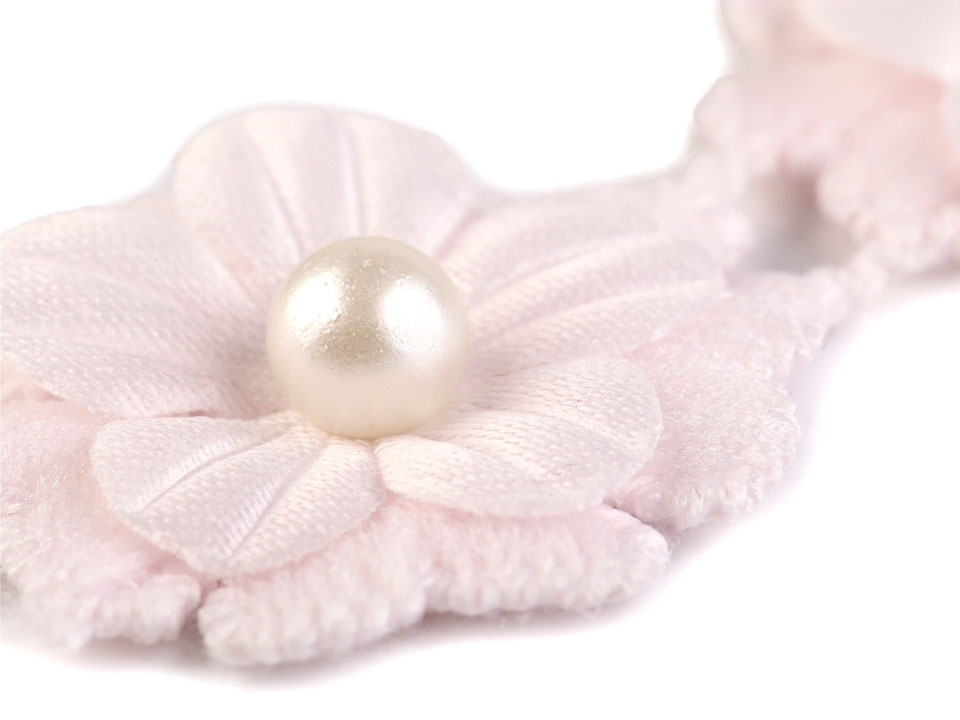Textilní květ je složený ze dvou různých vrstev. Uprostřed je zdobený perlou, která je ke květu pevně přinýtována. Působí bohatě a decentně zároveň.