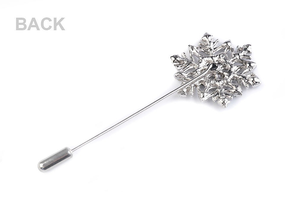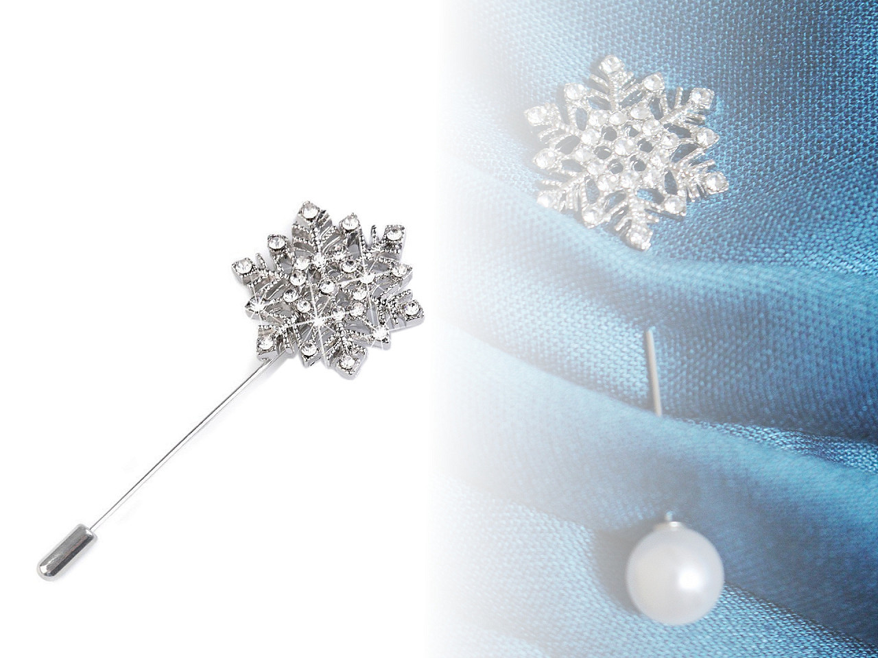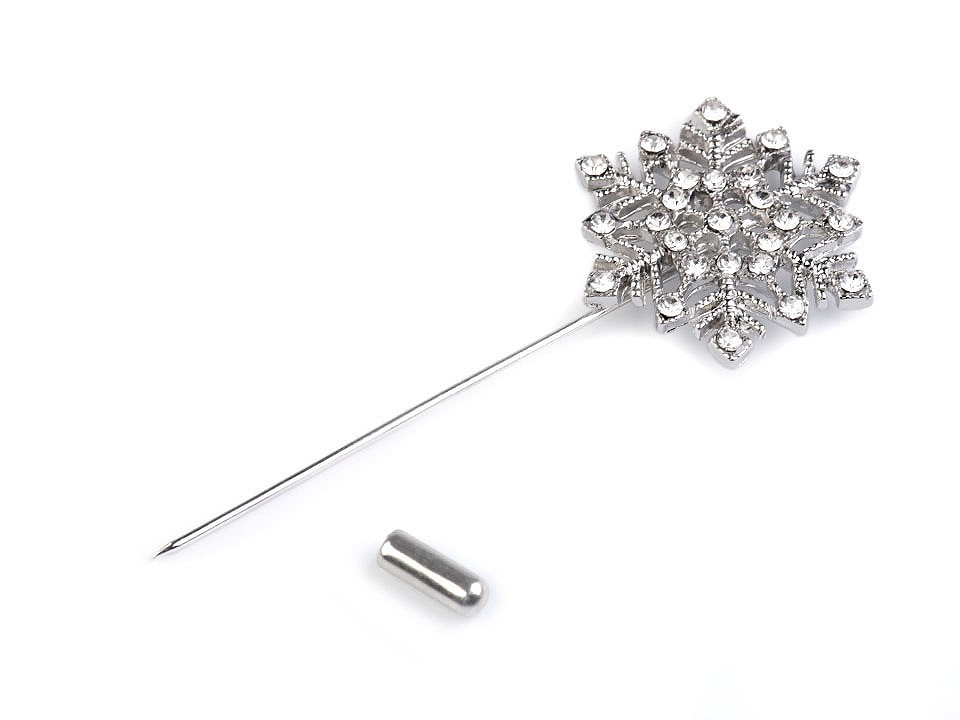 Ozdobný špendlík s vločkou nadchne každého příznivce zimního období. Špendlík je ideálním doplňkem ke kostýmku. Zajímavě vypadá v klopě nebo v klobouku. Hodí se jako brož k halence nebo s jeho pomocí můžete elegantně sepnout šátek.