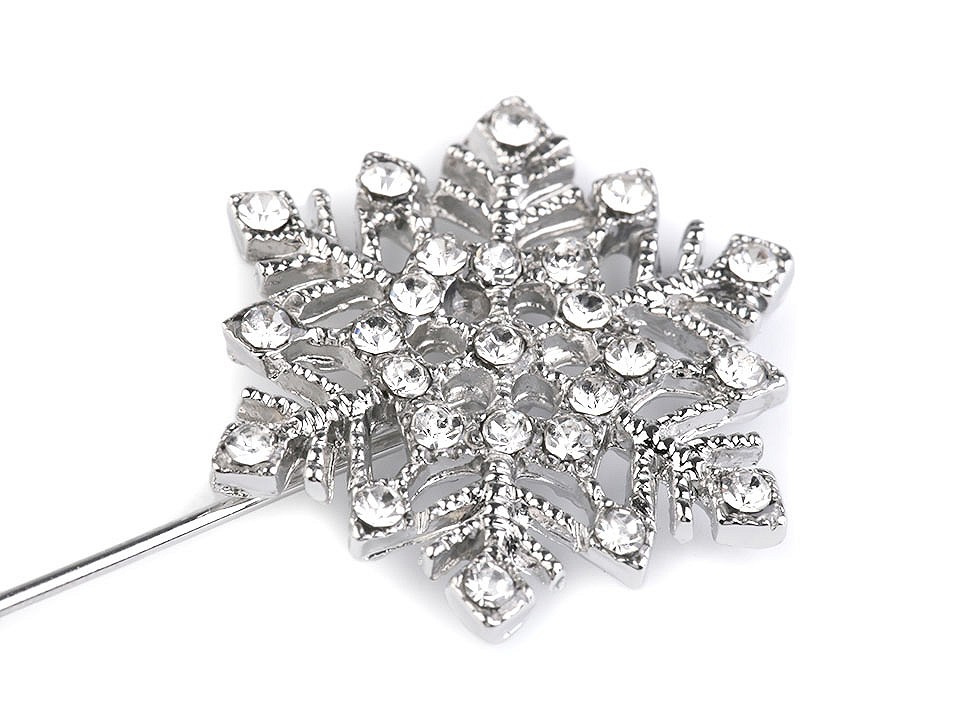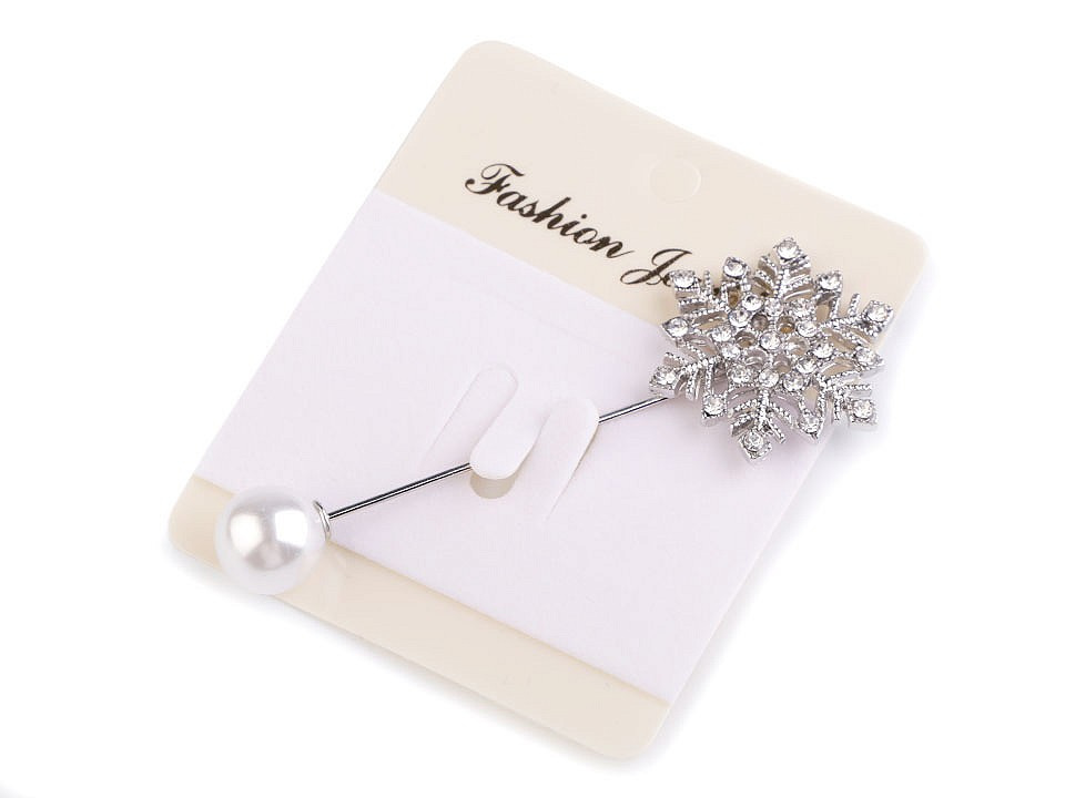 Vločka je ozdobena drobnými broušenými kamínky, které se oslnivě třpytí. Špendlík má na konci chránič v podobě perly proti popíchání nebo vyvlečení.