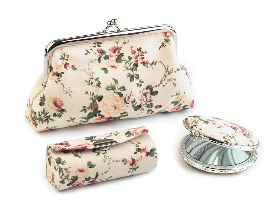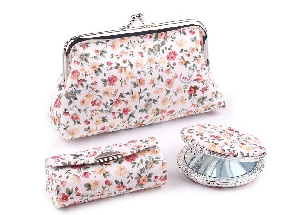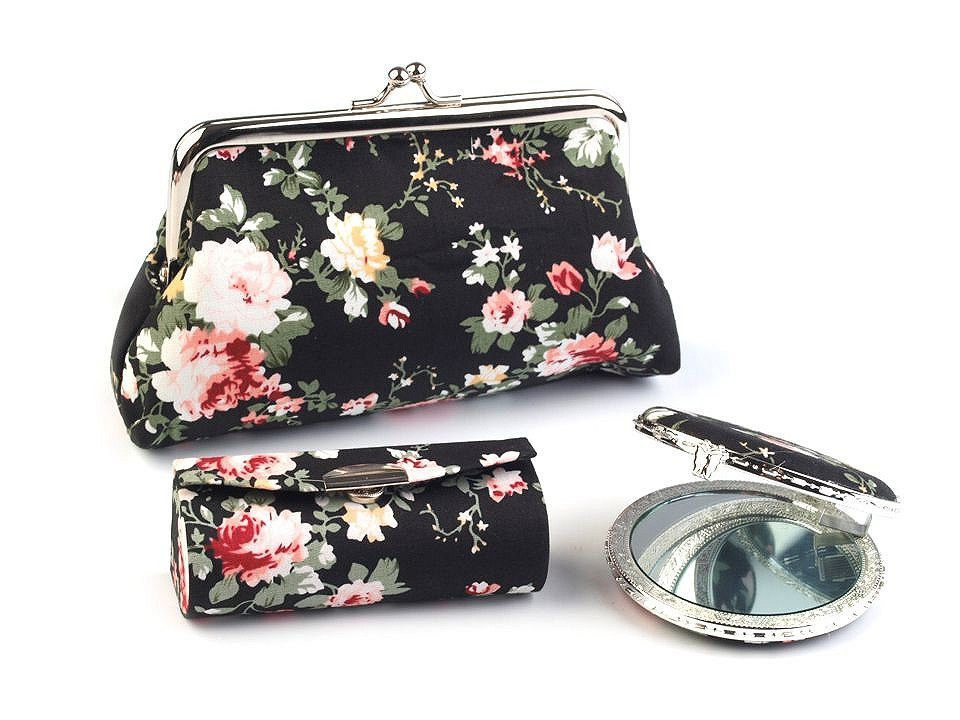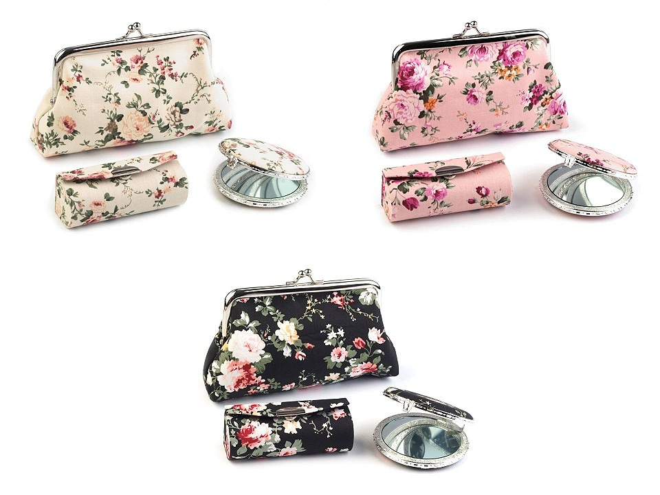 Praktický dámský kosmetický set obsahuje pouzdro na rtěnku, zrcátko (Ø 6,5 cm) a taštičku s polyesterovou podšívkou, do které se vám vejdou všechny potřebné šminky. Sady jsou k dostání v působivých květinových vzorech a jsou vyrobeny z kvalitních materiálů, které vám dlouho vydrží jako nové. Zrcátko je lemované plastovým okrajem, oceníte jeho nízkou hmotnost.