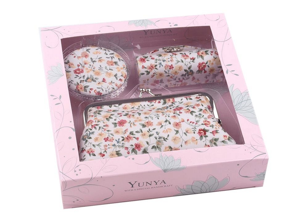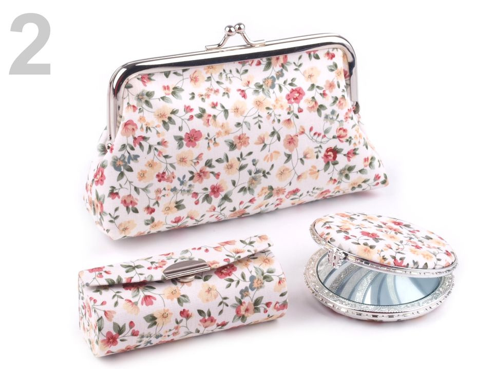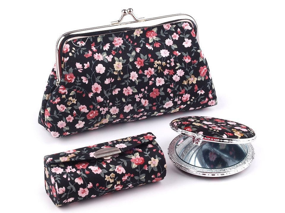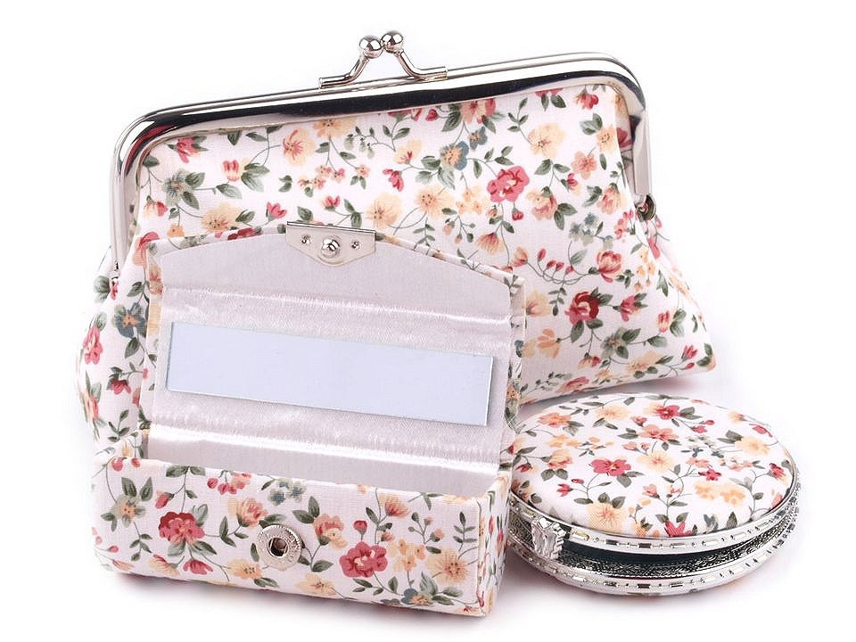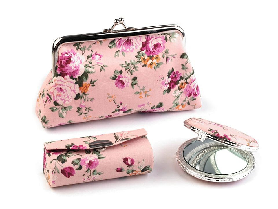 Praktický dámský kosmetický set obsahuje pouzdro na rtěnku, zrcátko (Ø 6,5 cm) a taštičku s polyesterovou podšívkou, do které se vám vejdou všechny potřebné šminky. Sady jsou k dostání v působivých květinových vzorech a jsou vyrobeny z kvalitních materiálů, které vám dlouho vydrží jako nové. Zrcátko je lemované plastovým okrajem, oceníte jeho nízkou hmotnost.