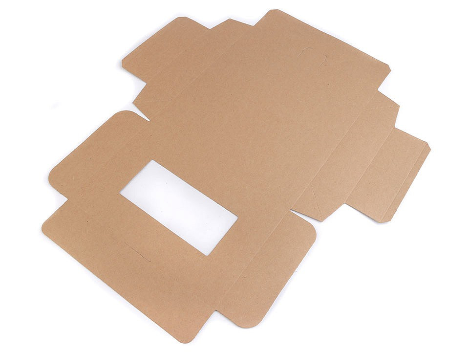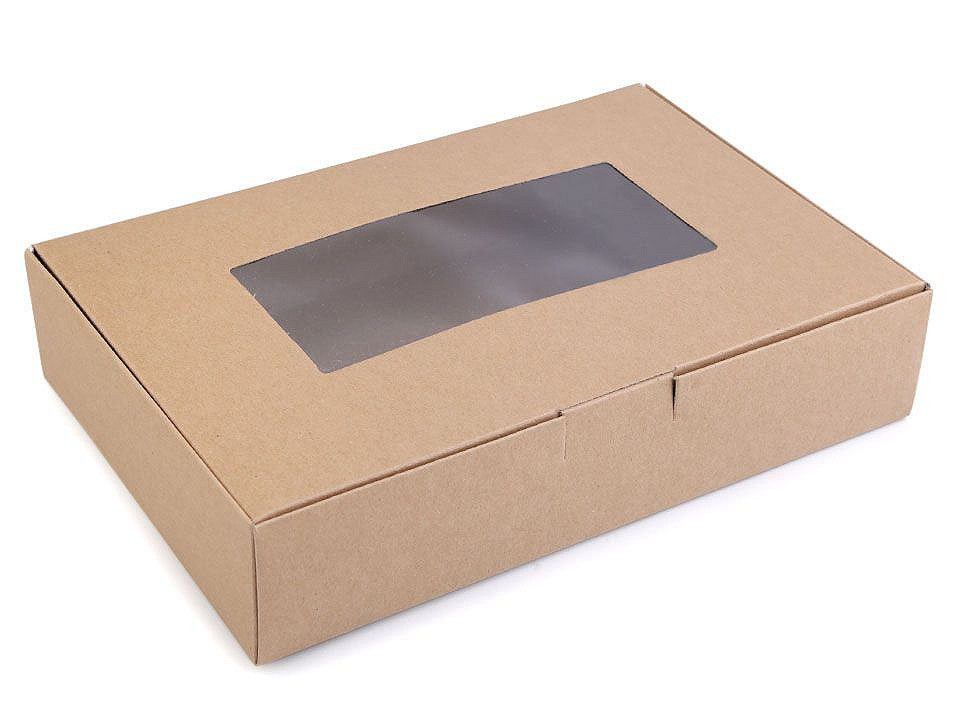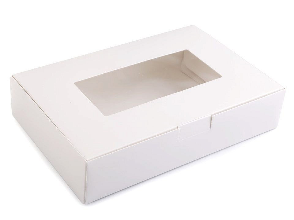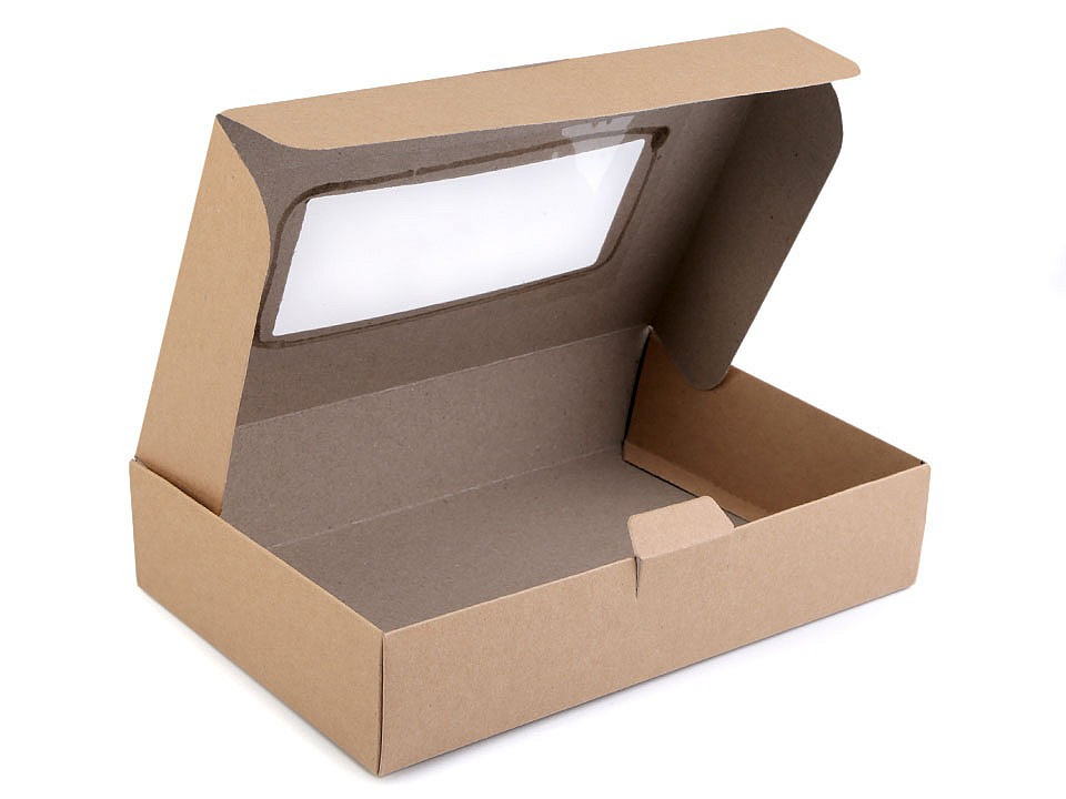 Papírová krabice má výřez ve víku z průhledné fólie. Využijete ji na balení dárků, šátků, svatební výslužky apod. Můžete si ji i dozdobit podle svého vkusu.
