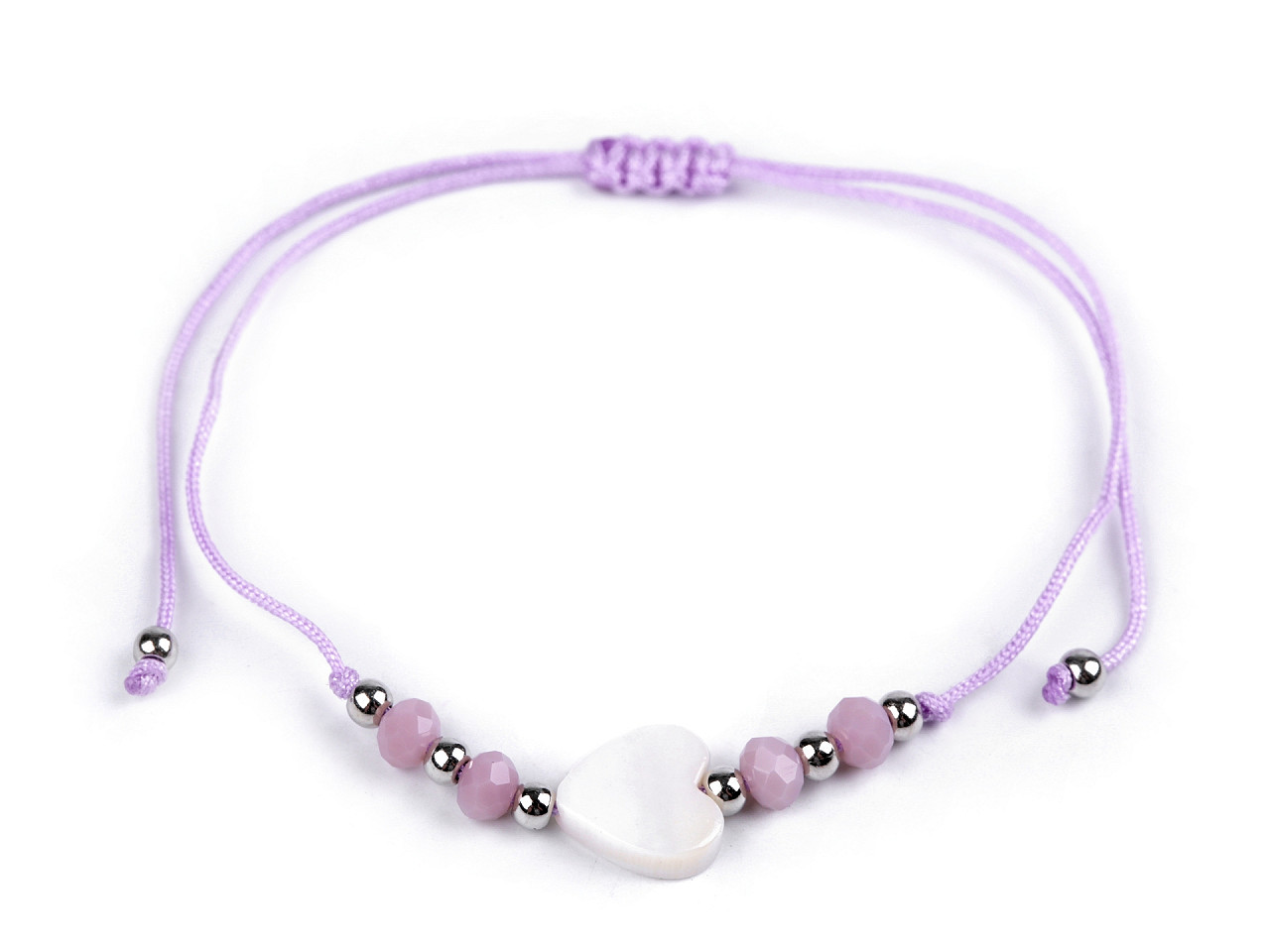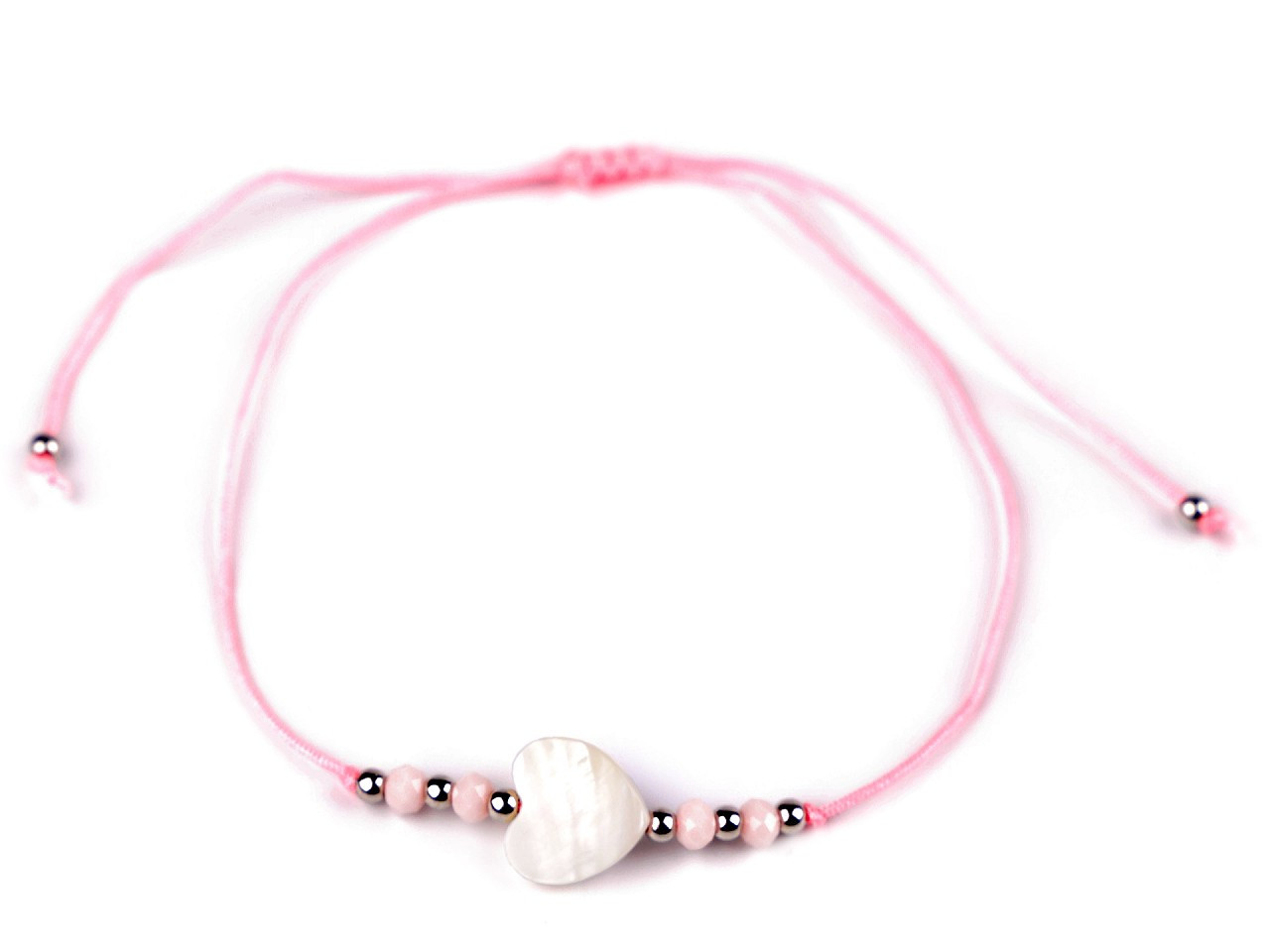 Na šňůrky je doprostřed navlečené srdíčko velké 1 cm, broušené a kovové korálky.