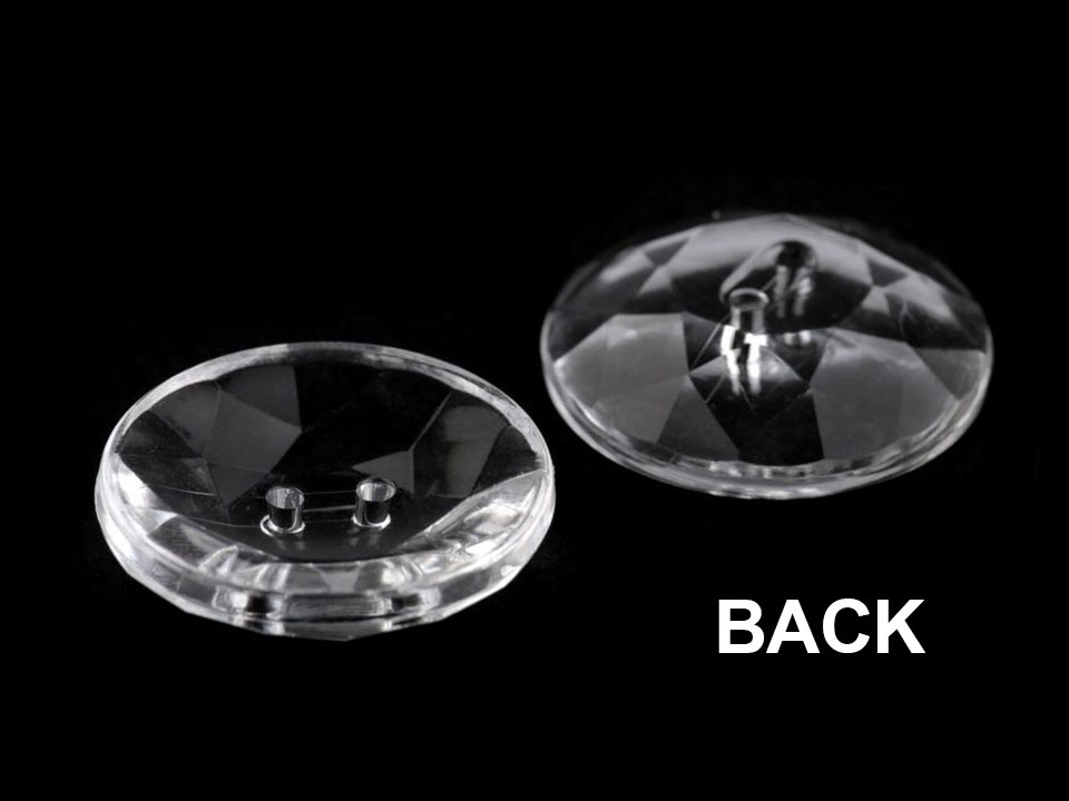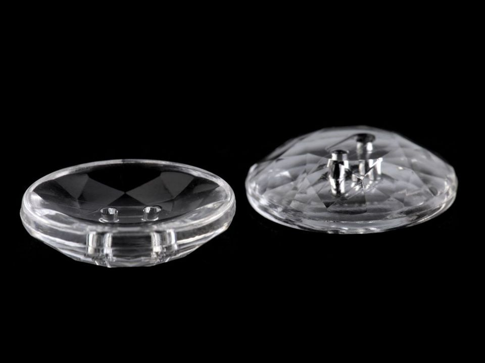 Dvoudírkové knoflíky klenutého tvaru jsou průhledné se spodní broušenou stranou. Můžete je našít na svetry, šaty, saka, kabáty apod.