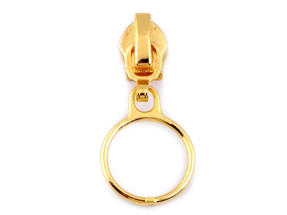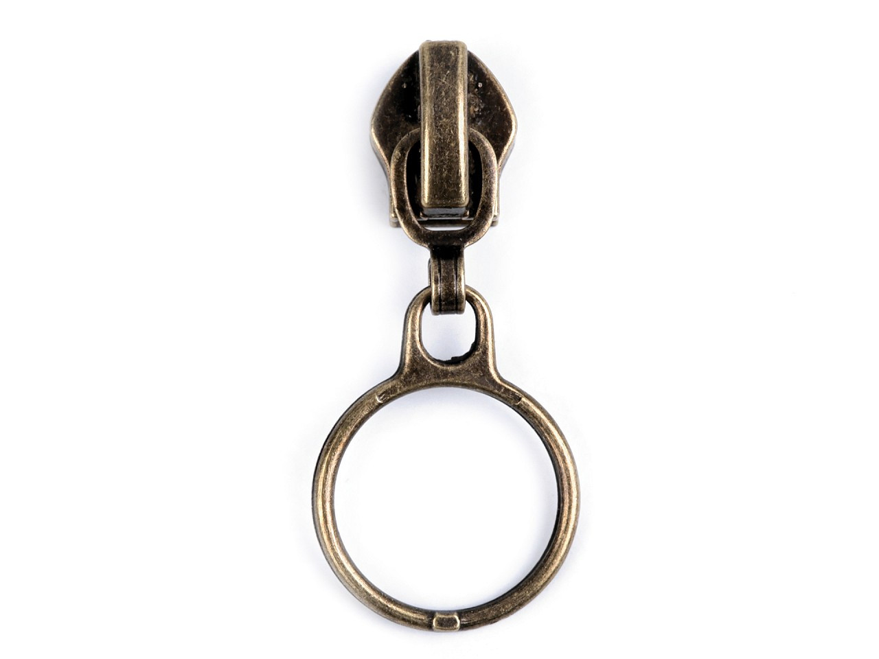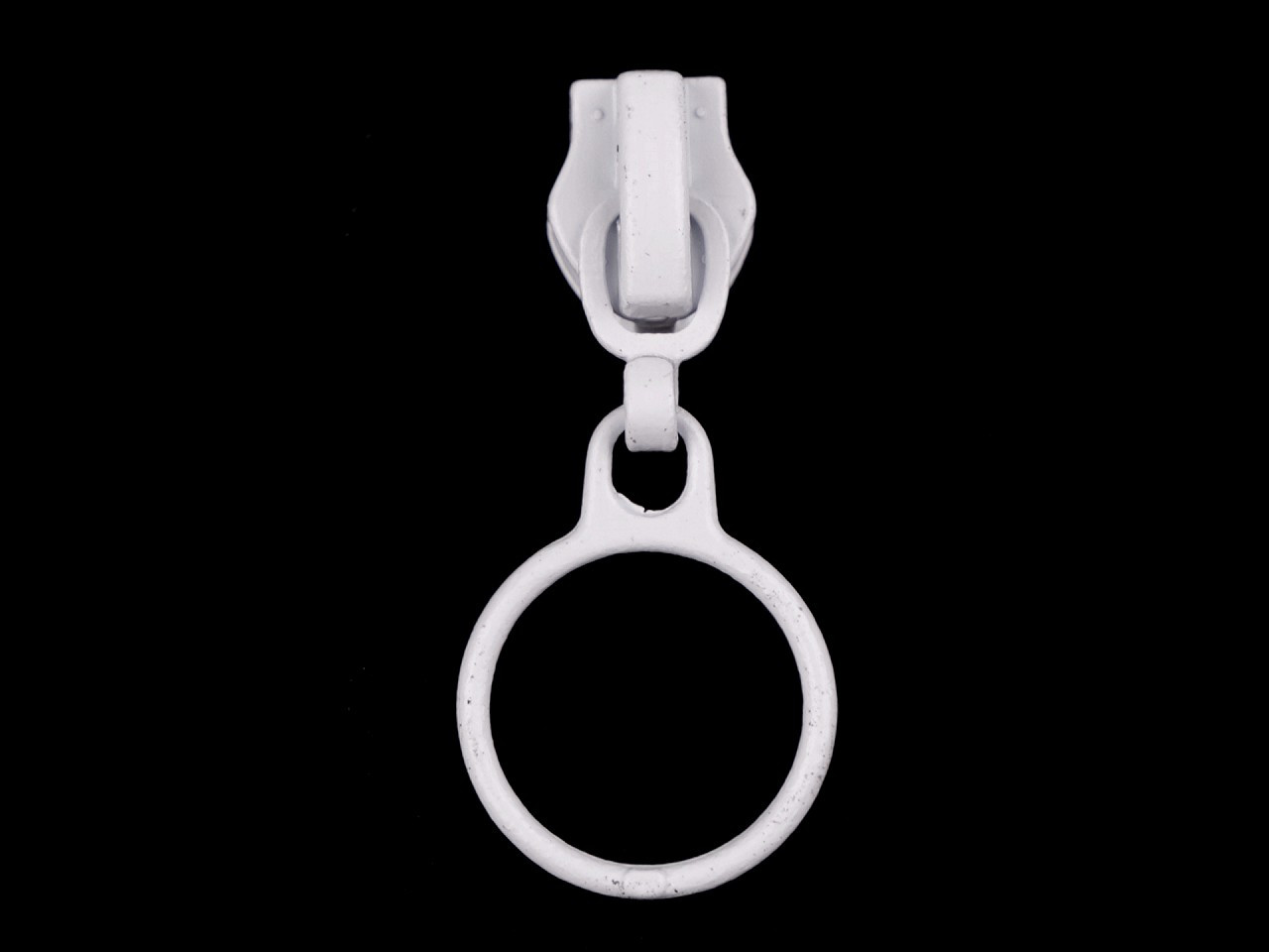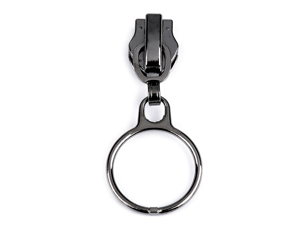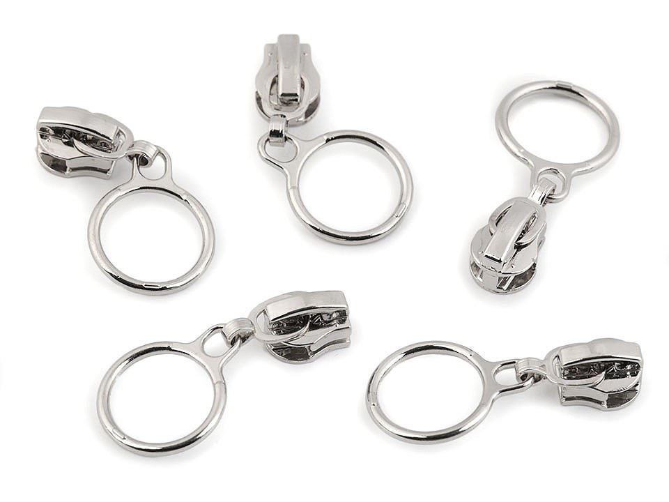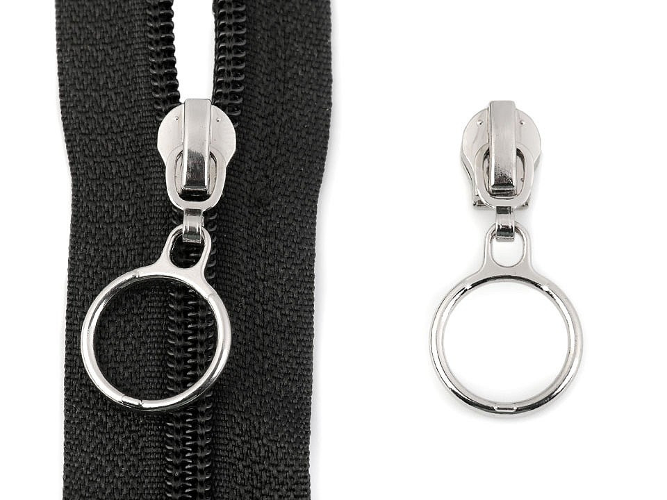 Kovový jezdec s táhlem v podobě kroužku je určený ke spirálovým zipům o šíři 5 mm v metráži, které u nás najdete pod kódem