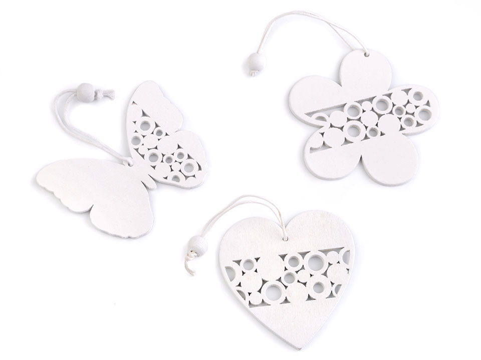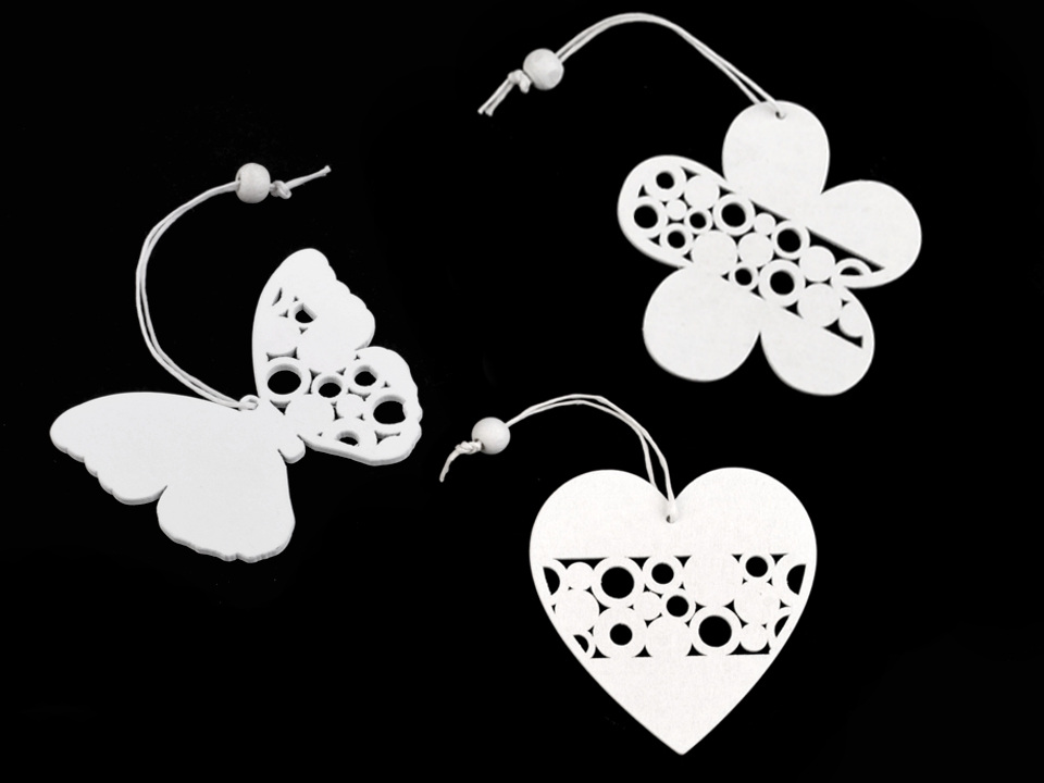 Květ Ø6 cm, srdce 6 x 6 cm, motýl 5,5 x 6,5 cm. Závěs 8 cm.