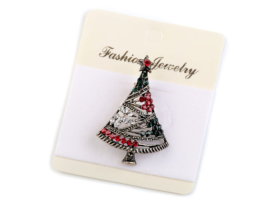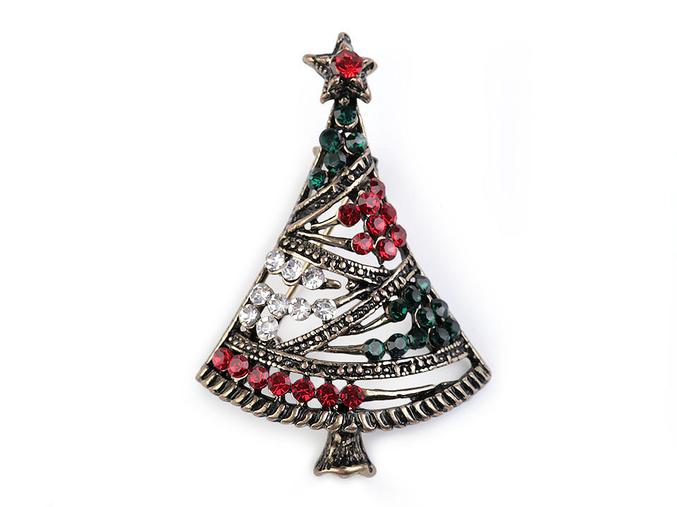 Brož vánoční stromeček působí starobylým, vintage dojmem. Kovový základ je osázený barevnými broušenými kamínky, které se oslnivě třpytí. Na zadní straně je brožový špendlík s pojistkou proti otevření.