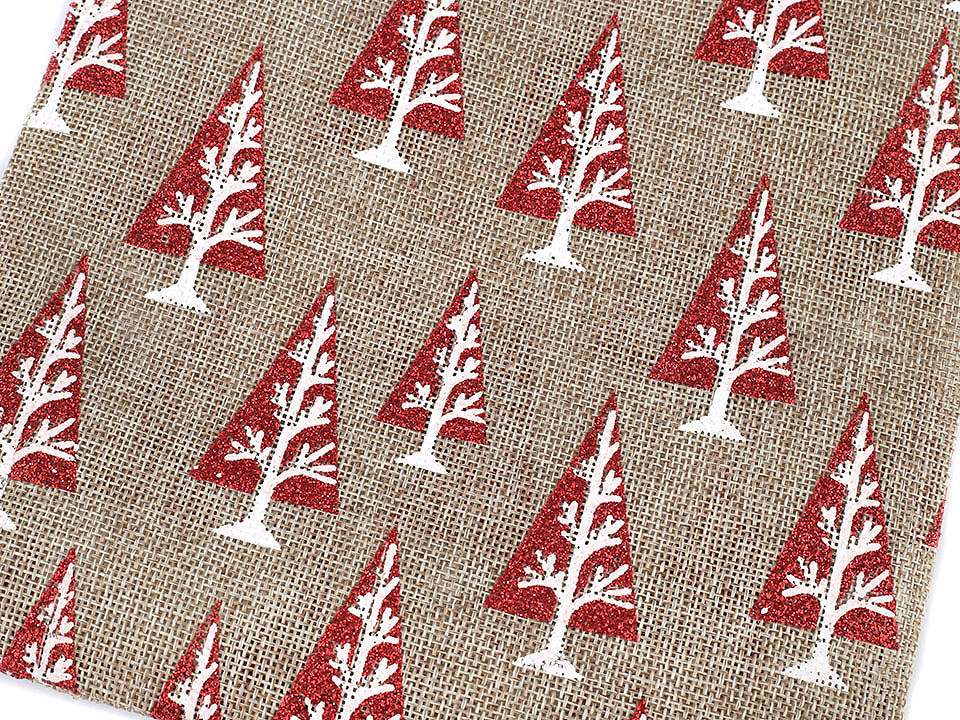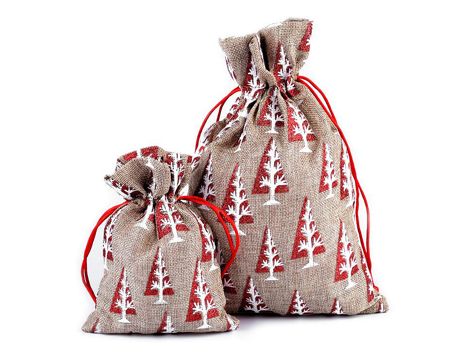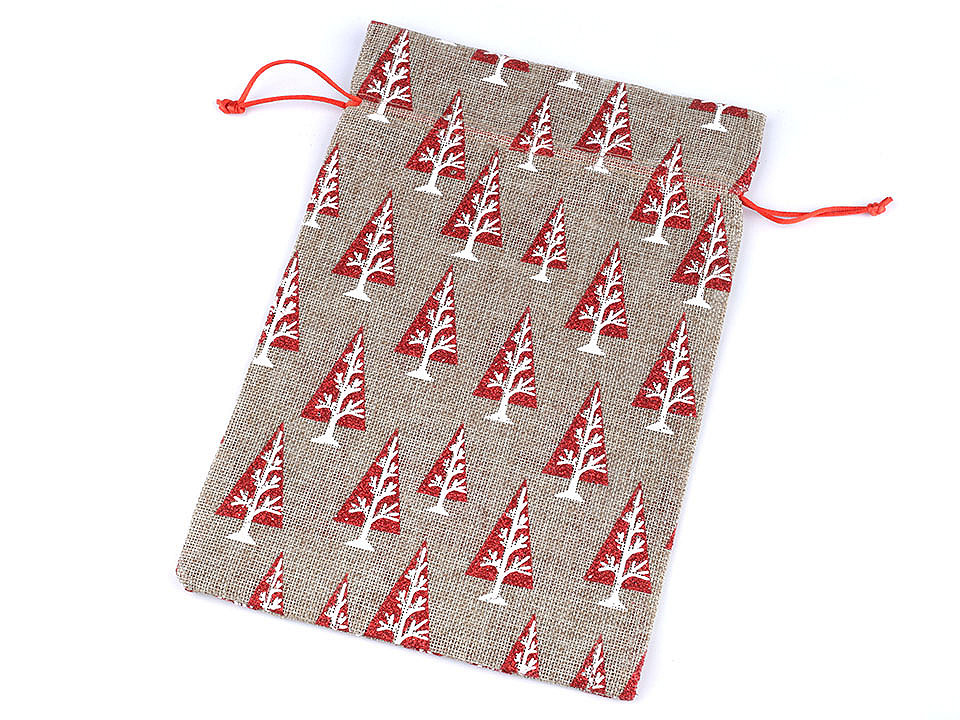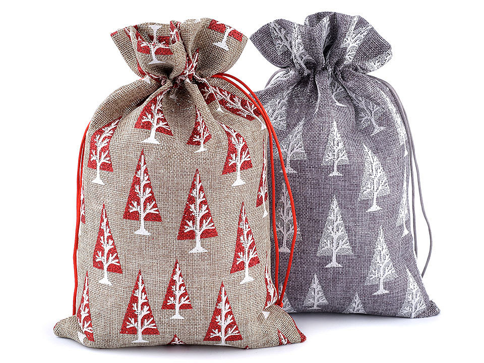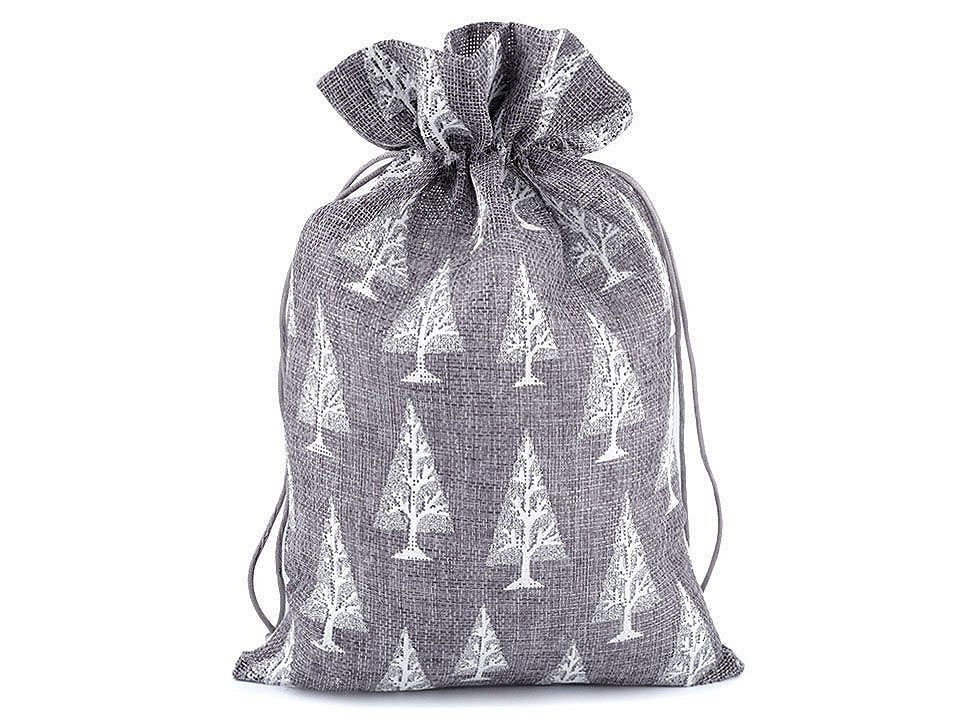 Dárkový pytlík s potiskem stromečků je ideální dekorací na Vánoce. Pytlík je zajímavý materiálem, který imituje jutu, a třpytivým potiskem stromečků s glitry. Stahuje se pomocí saténové šňůrky. Do pytlíku můžete schovat drobné dárky nebo jej použít jako vánoční dekoraci.