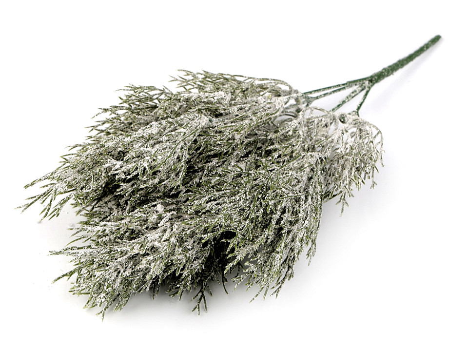 Dekorační větvička jehličí je ozdobena třpytivými glitry, které připomínají sníh.