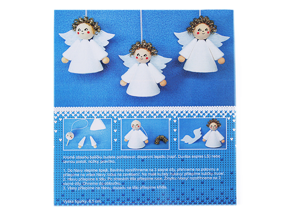 Kreativní sada andělé k zavěšení nadchne děti i dospělé. Můžete je využít jako roztomilou vánoční ozdobu. Složit postavičky tří andílků je snadné. Všechny potřebné díly jako např. vatové hlavičky, vlasy, křídla a další jsou součástí sady. V balíčku je i podrobný popis návodu na výrobu. Kromě obsahu balíčku budete potřebovat: disperzní lepidlo nebo tavnou pistoli, nůžky a pravítko.