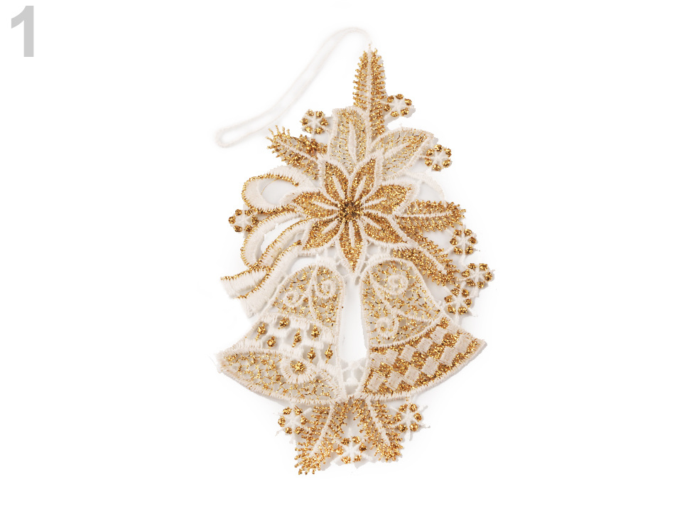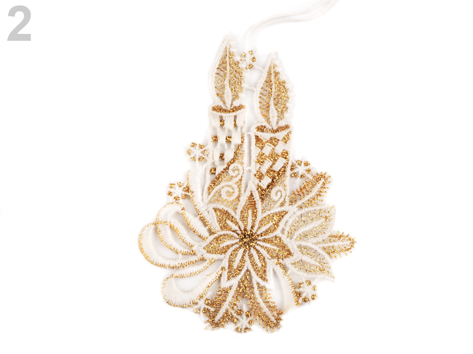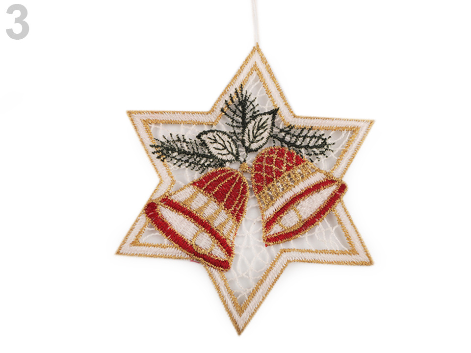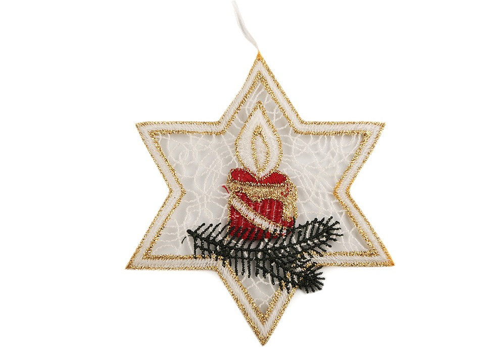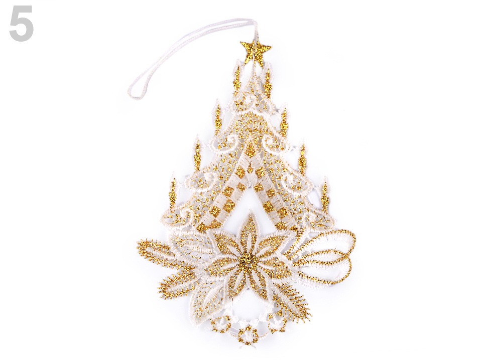 Krajkové ozdoby jsou lehké, naškrobené a dobře drží tvar. Díky lurexu se jemně třpytí. Můžete je pověsit na stromek, na věnce nebo do oken.