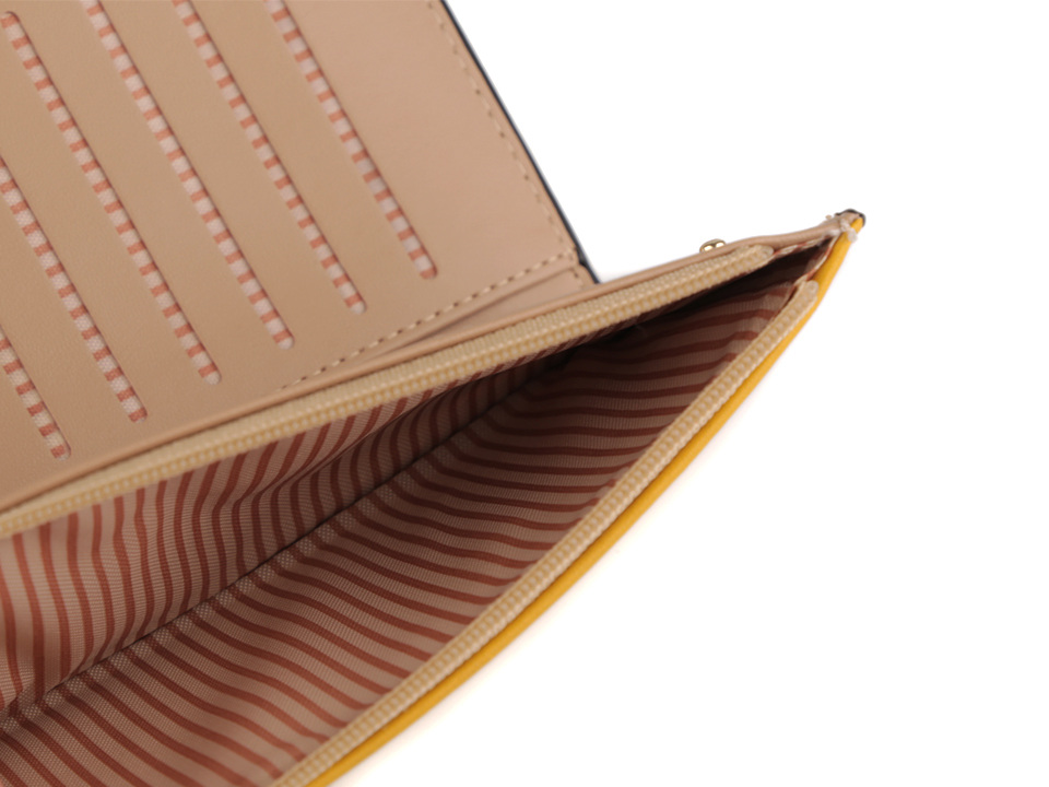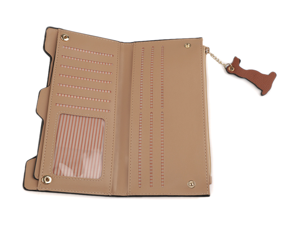 Peněženka je rozdělena do dvou částí. První z nich je uzavíratelná na zip, a můžete ji proto využít k pohodlnému uložení mincí. Druhá část se uzavírá na patenty a obsahuje 3 velké přihrádky na bankovky či mobilní telefon, 12 přihrádek na karty a 1 na fotky. Součástí jedné z větších kapes je odnímatelná karta, která obsahuje dalších 6 přihrádek na karty, 1 na fotografie a 2 přihrádky na SIM nebo SD karty.