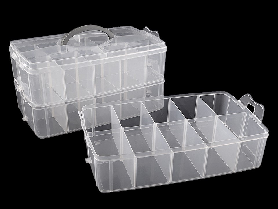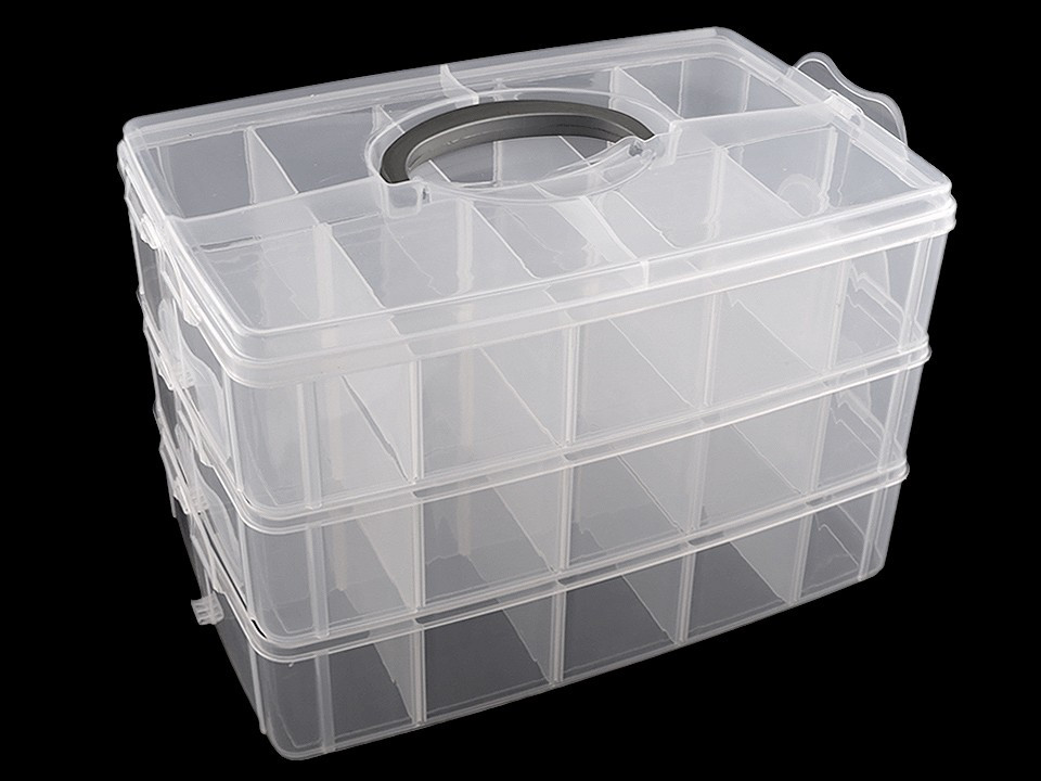 Třípatrový rozkládací zásobník se hodí na skladování komponentů pro kreativní tvorbu. Každý zásobník je víkem toho spodního, se kterým se spojí sponou na boku zásobníku. Vrchní patro má odnímatelné víko s uchem na přenášení. Také se zavírá na sponu. Dovnitř je vidět díky průhlednému plastu.
