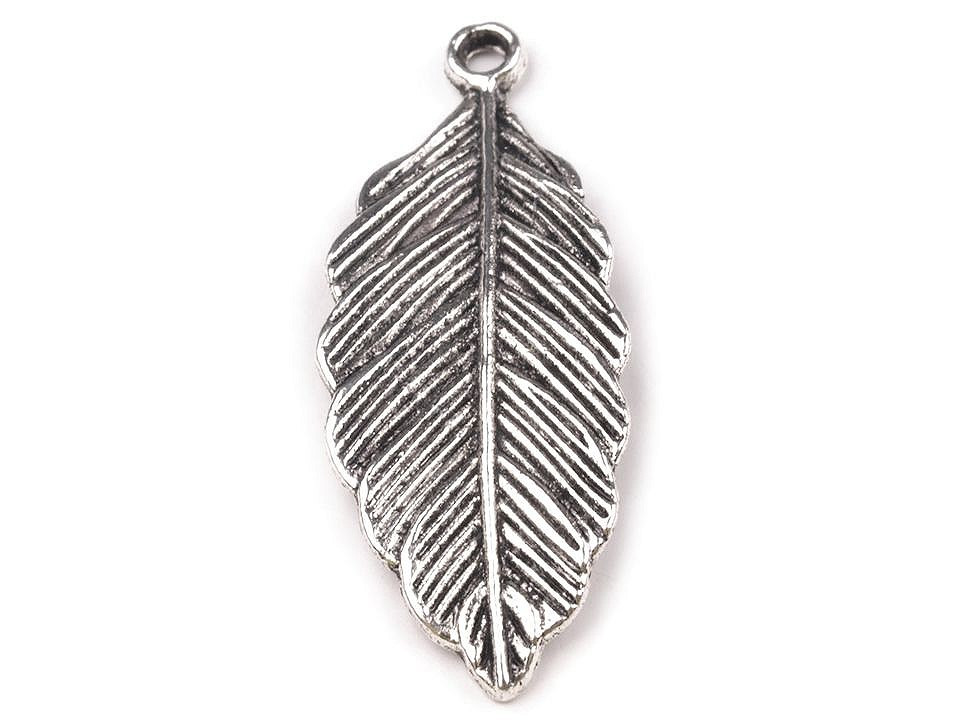 Kovový přívěsek ve tvaru bohatě žilkovaného listu je oboustranný. Celý přívěsek působí jako skutečný lístek zakletý do kovu.