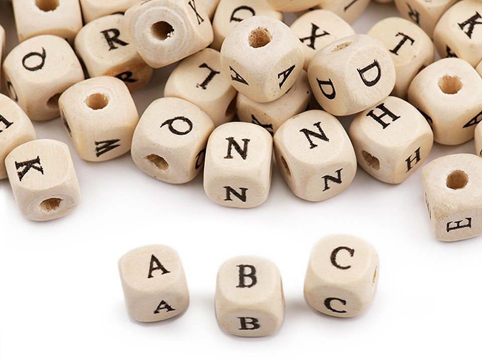 Dřevěné korálky ve tvaru kostky s potiskem písmenek.