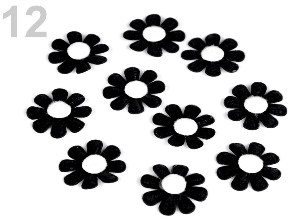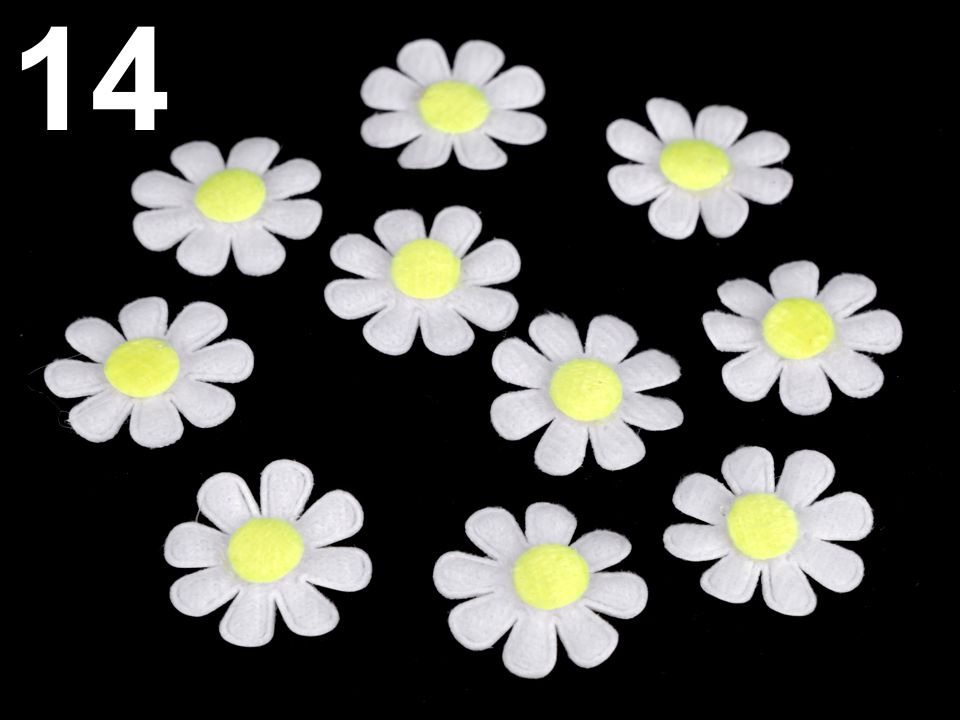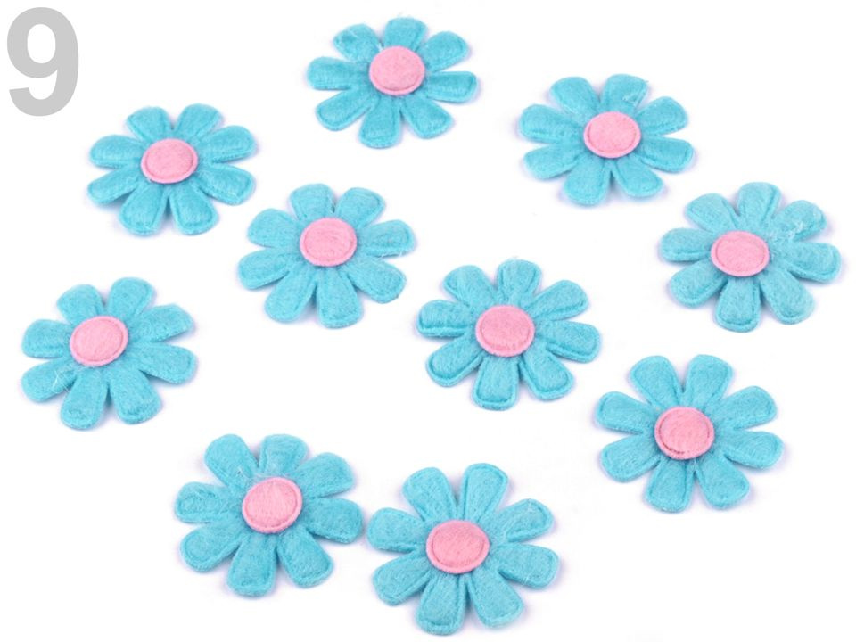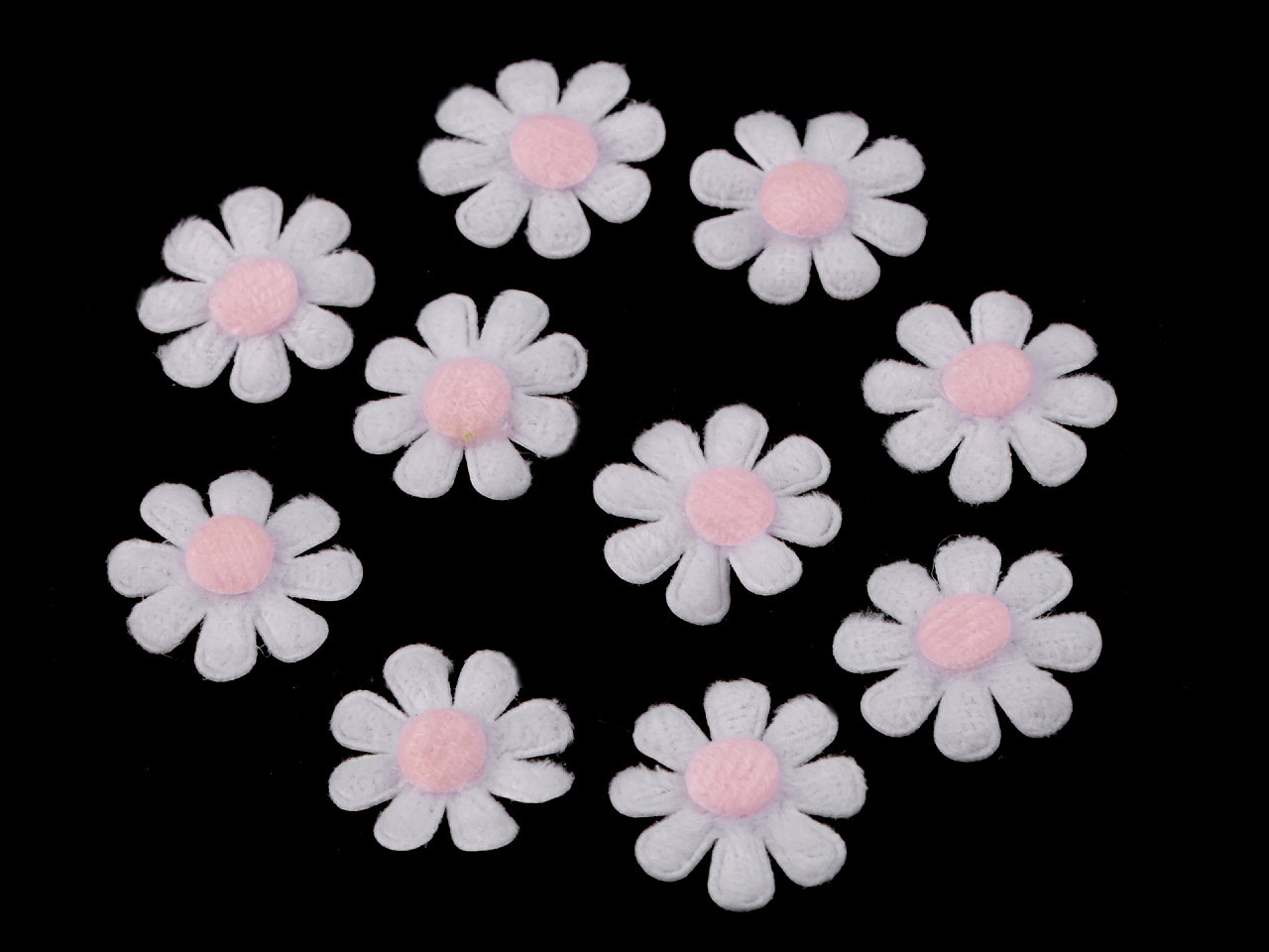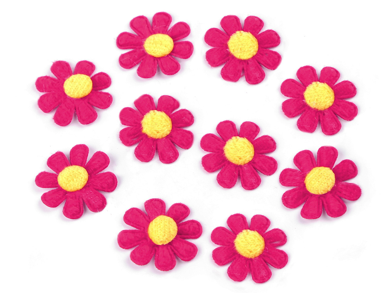 Květiny o průměru 27 mm jsou vyrobeny z na dotek příjemného materiálu. Můžete je našít jako ozdobu na oblečení nebo pomocí textilního lepidla přilepit např. na přání.