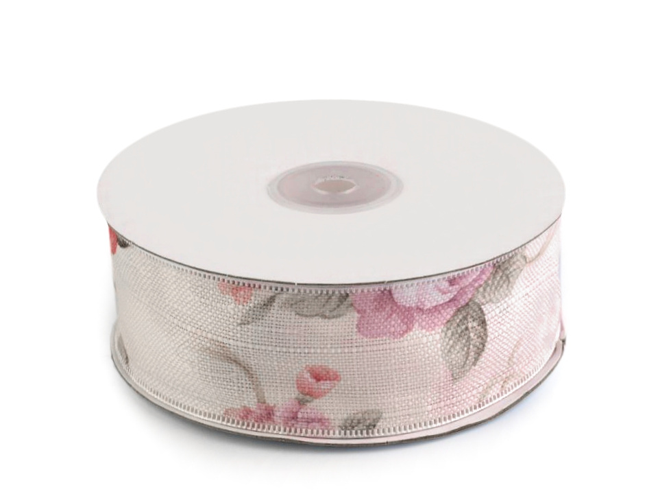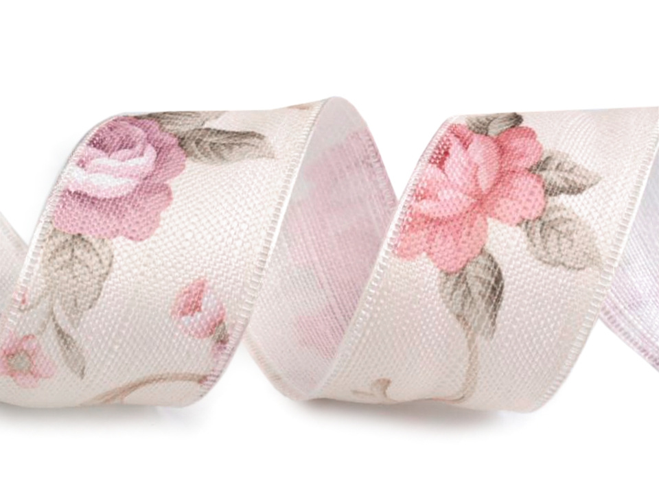 Tkaná stuha s potiskem šípkových růží je určená k aranžování a výrobě dekorací. Potisk je jednostranný.