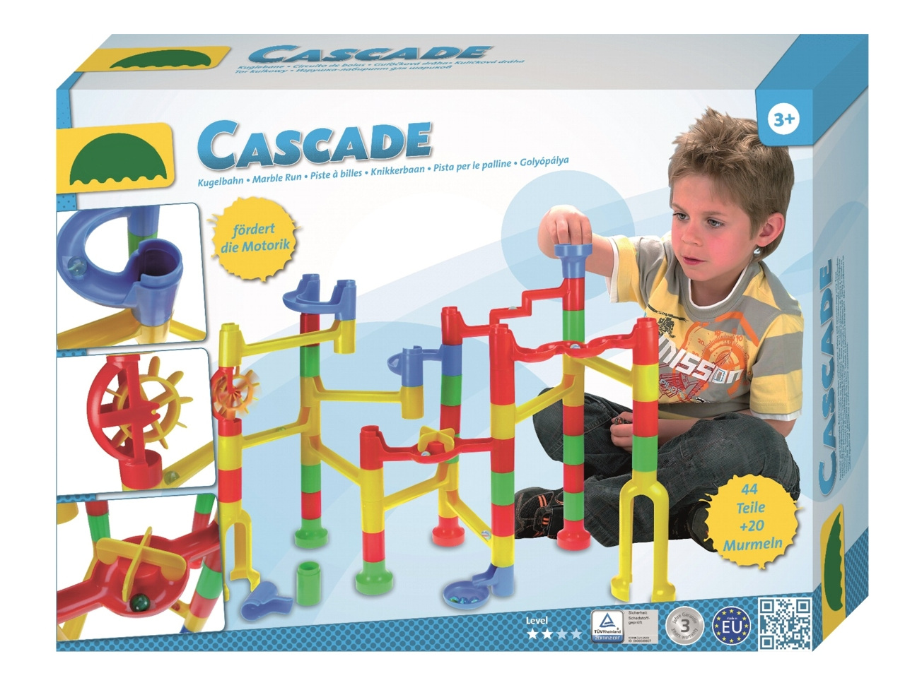 Barevná, plastová kuličková dráha kaskáda. Balení obsahuje 48 různě sestavitelných dílků a 20 kuliček. Baleno v ozdobné krabici o velikosti 26x9x40 cm.