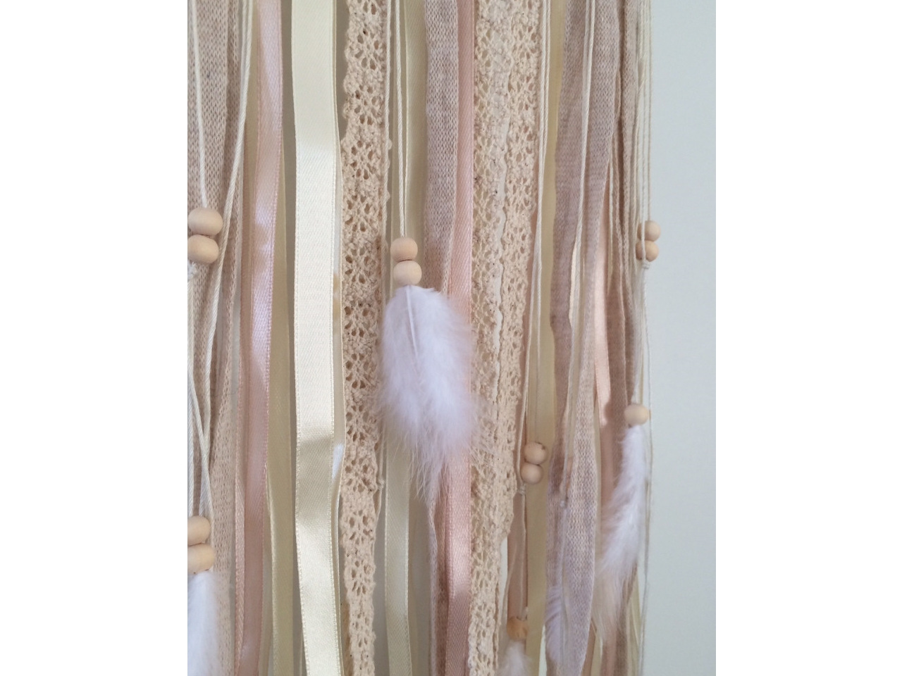 Složení: dřevo, bavlna, krajka, stuhy, peří, korálky