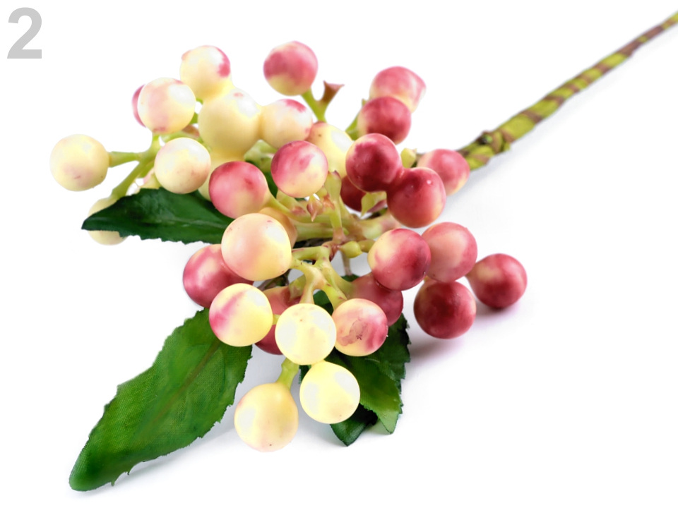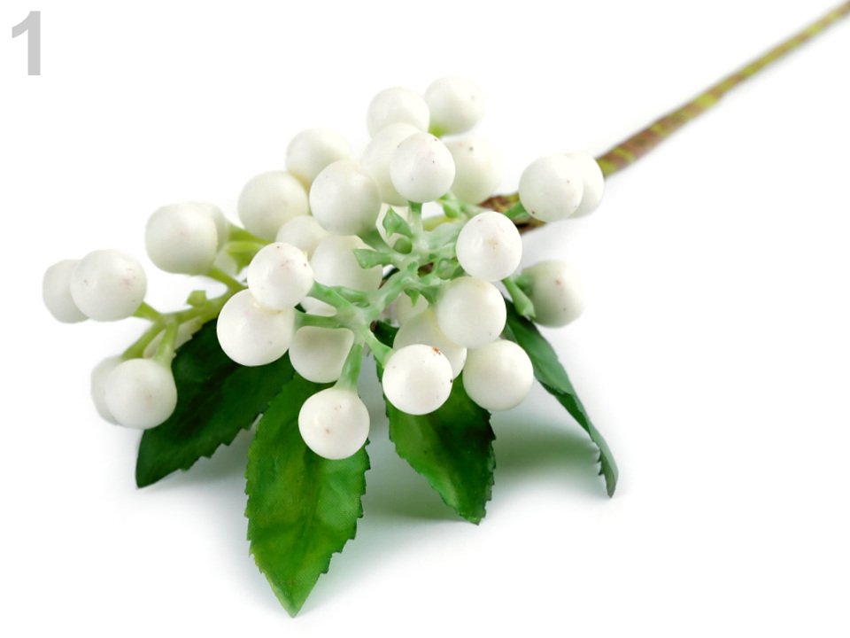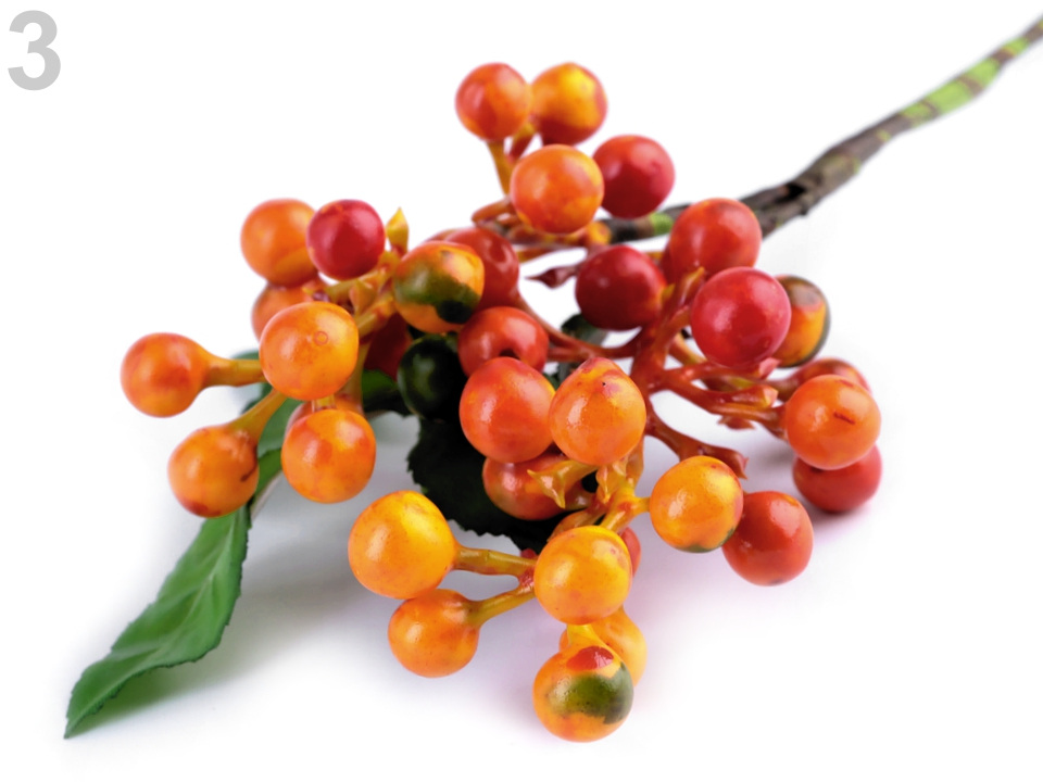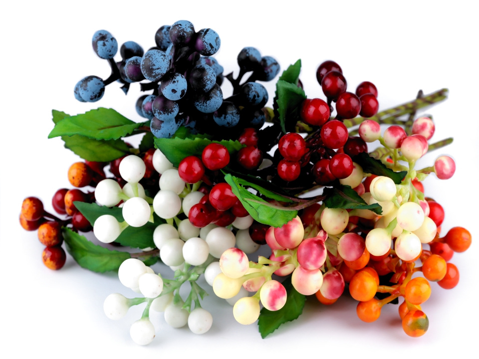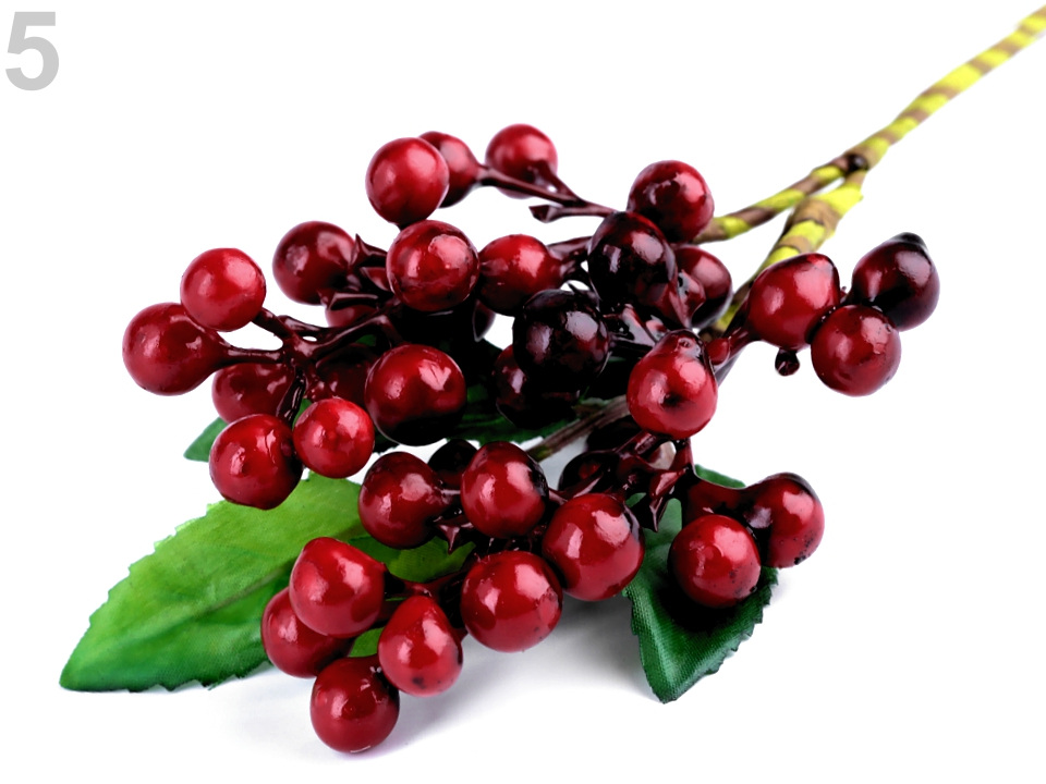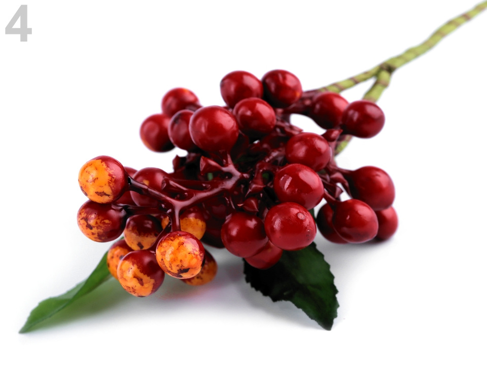 Dekorační umělé bobule si snadno spletete se živými větvičkami. Bobulky jsou vyrobené z polystyrenu. Stonek tvoří ohebný drát.
