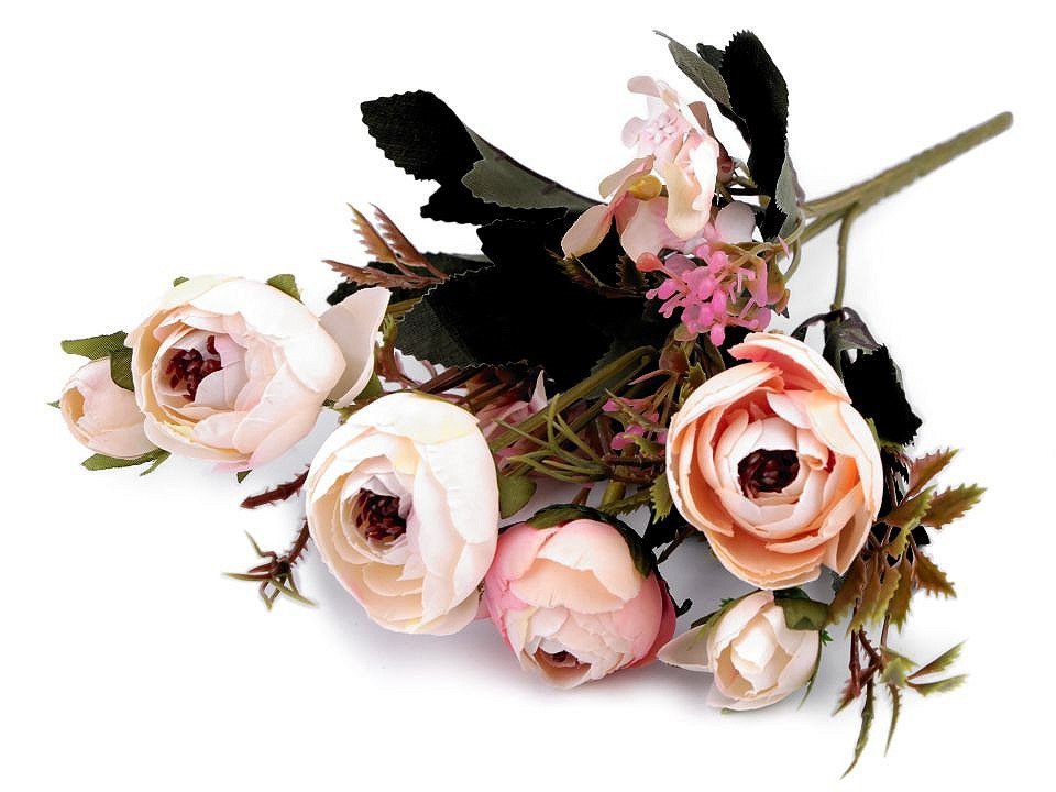 Umělý pryskyřník si snadno spletete s jeho živou předlohou, na rozdíl od ní, vám ale déle vydrží. Květy a lístky jsou textilní. V jednom svazku je 5 ohebných větviček s květy.