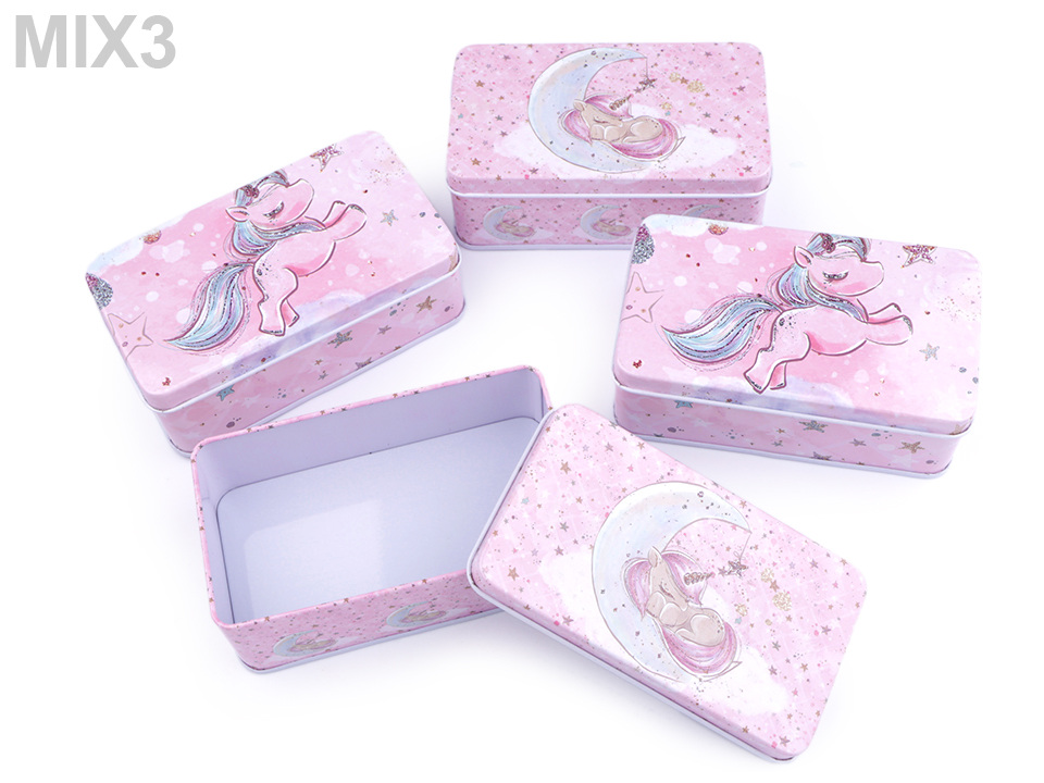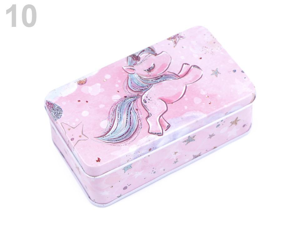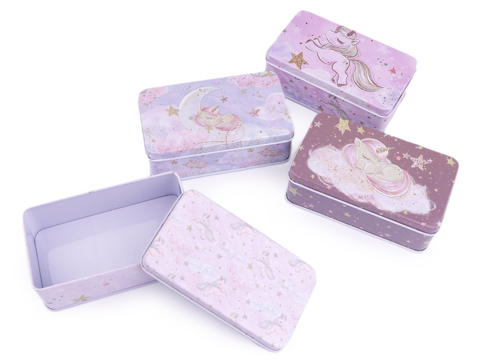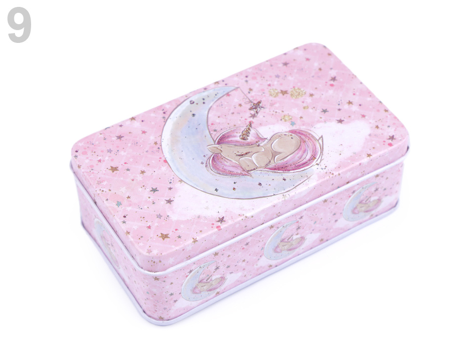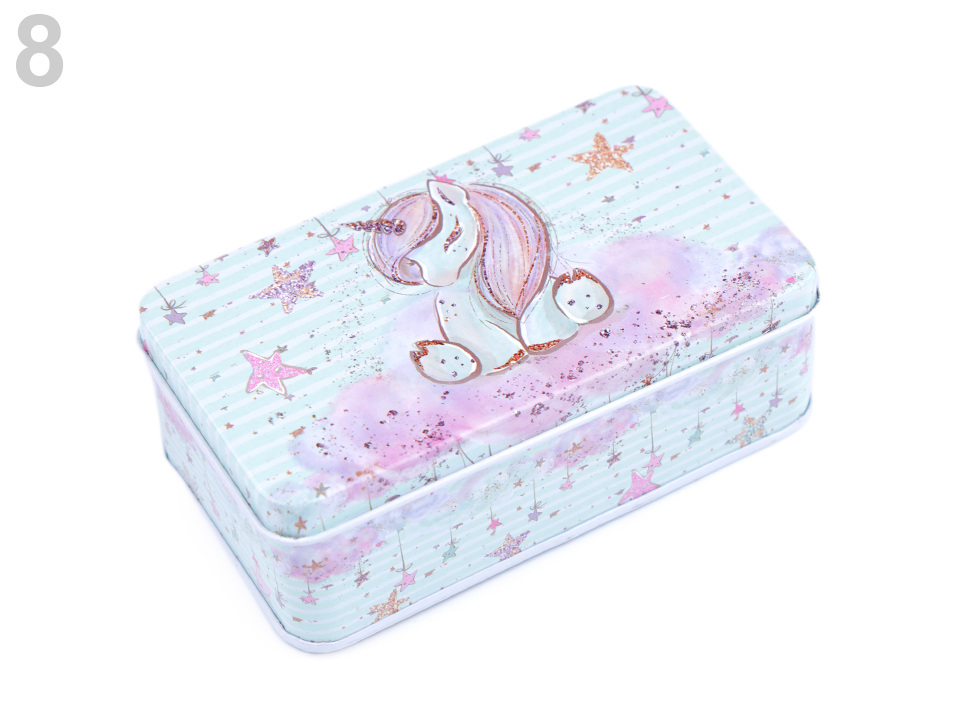 Malá plechová krabička s roztomilým motivem jednorožce. Využijete ji především na uschování drobných šperků jako jsou prstýnky, náušnice nebo náramky, hodí se také na knoflíky, gumičky, různé bižuterní komponenty a jiné drobnosti. Krabička se stane praktickým i ozdobným prvkem vašeho interiéru.