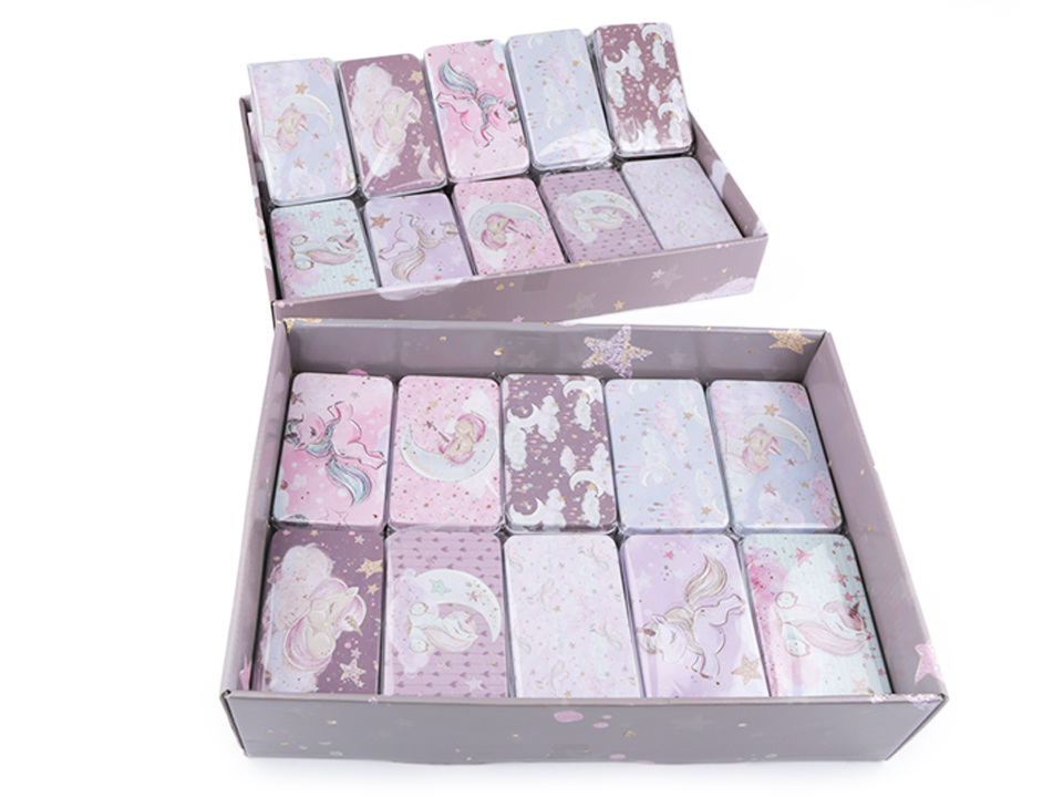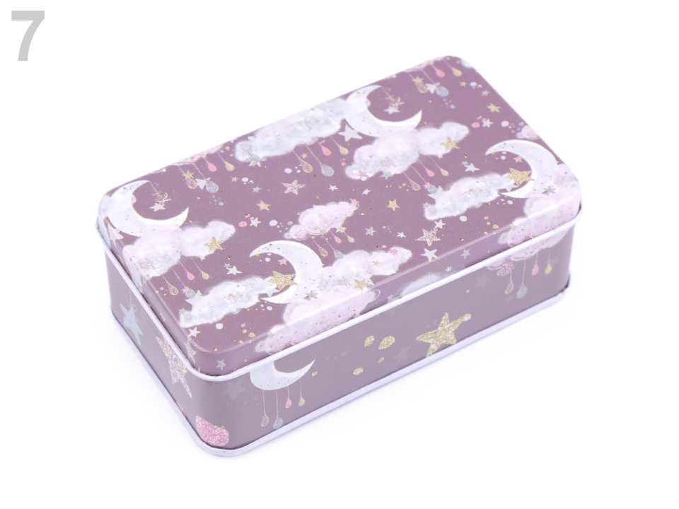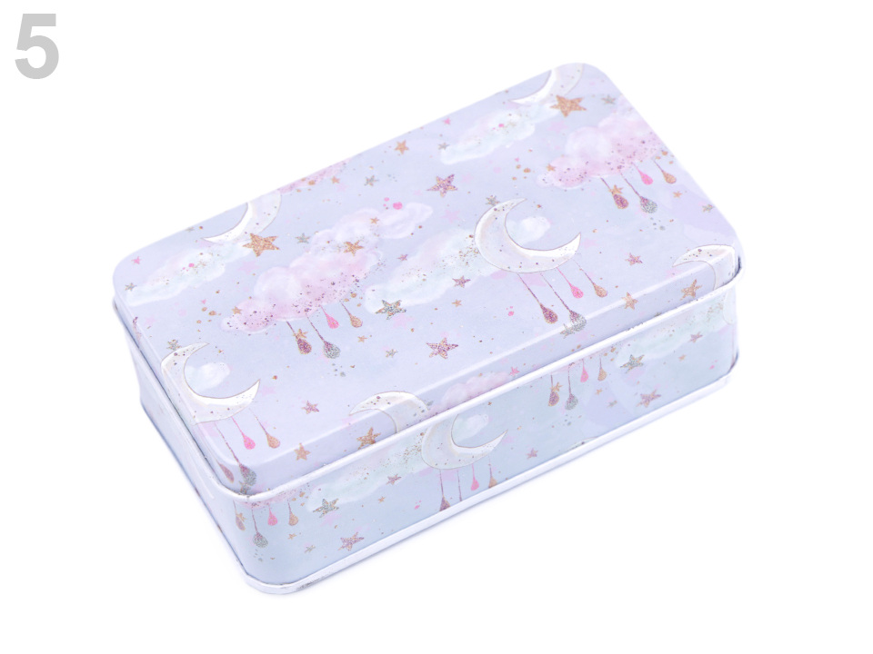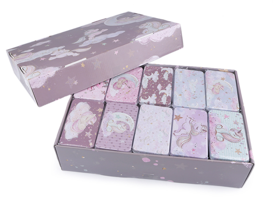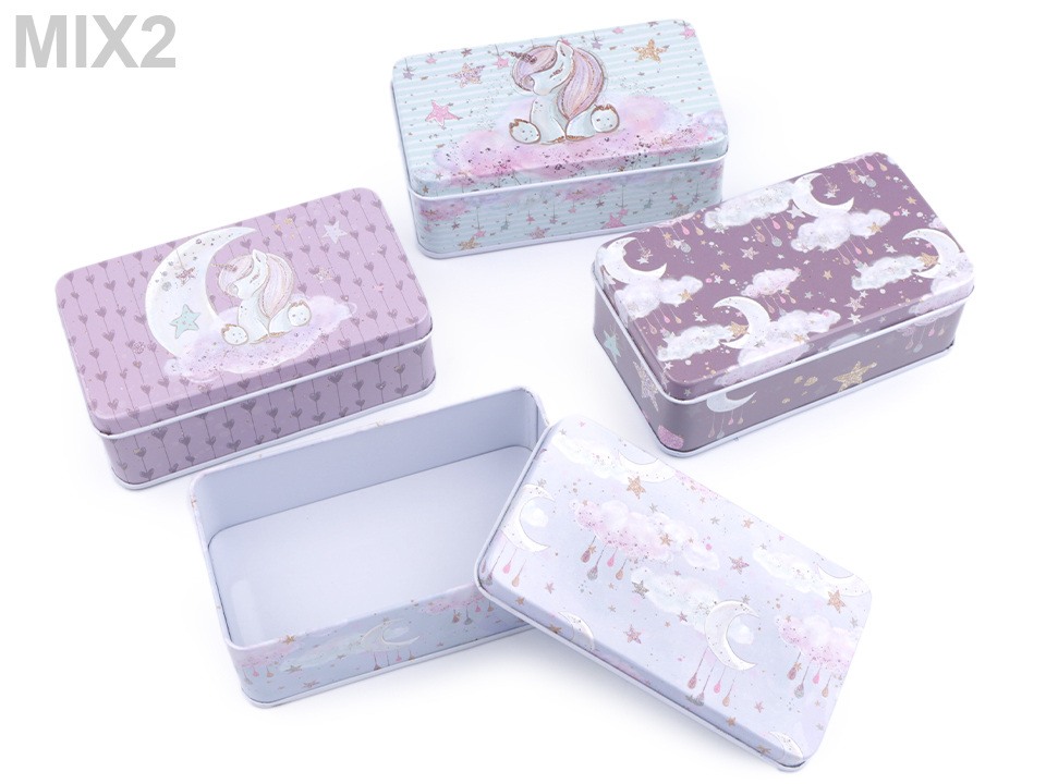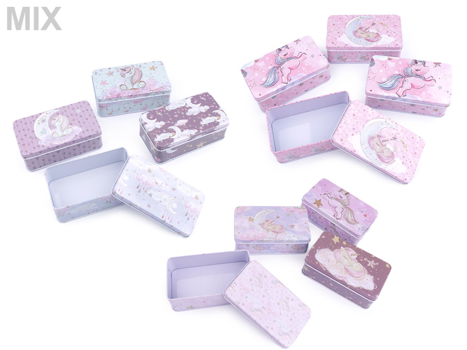 Malá plechová krabička s roztomilým motivem jednorožce. Využijete ji především na uschování drobných šperků jako jsou prstýnky, náušnice nebo náramky, hodí se také na knoflíky, gumičky, různé bižuterní komponenty a jiné drobnosti. Krabička se stane praktickým i ozdobným prvkem vašeho interiéru.