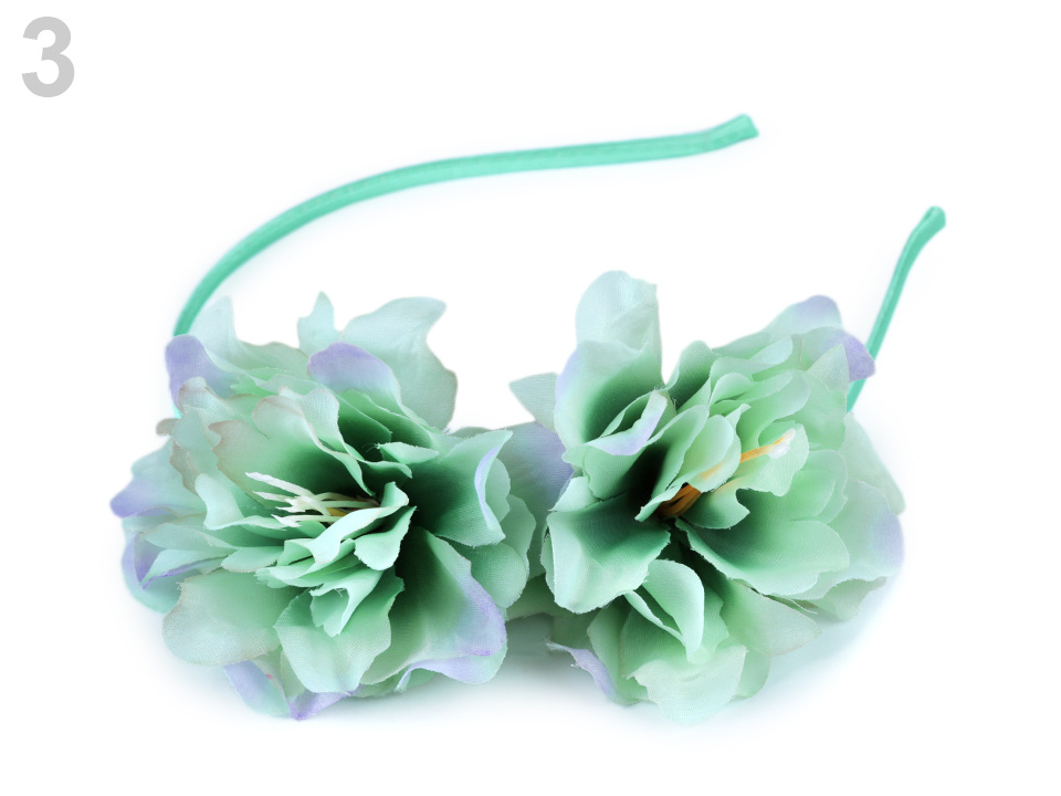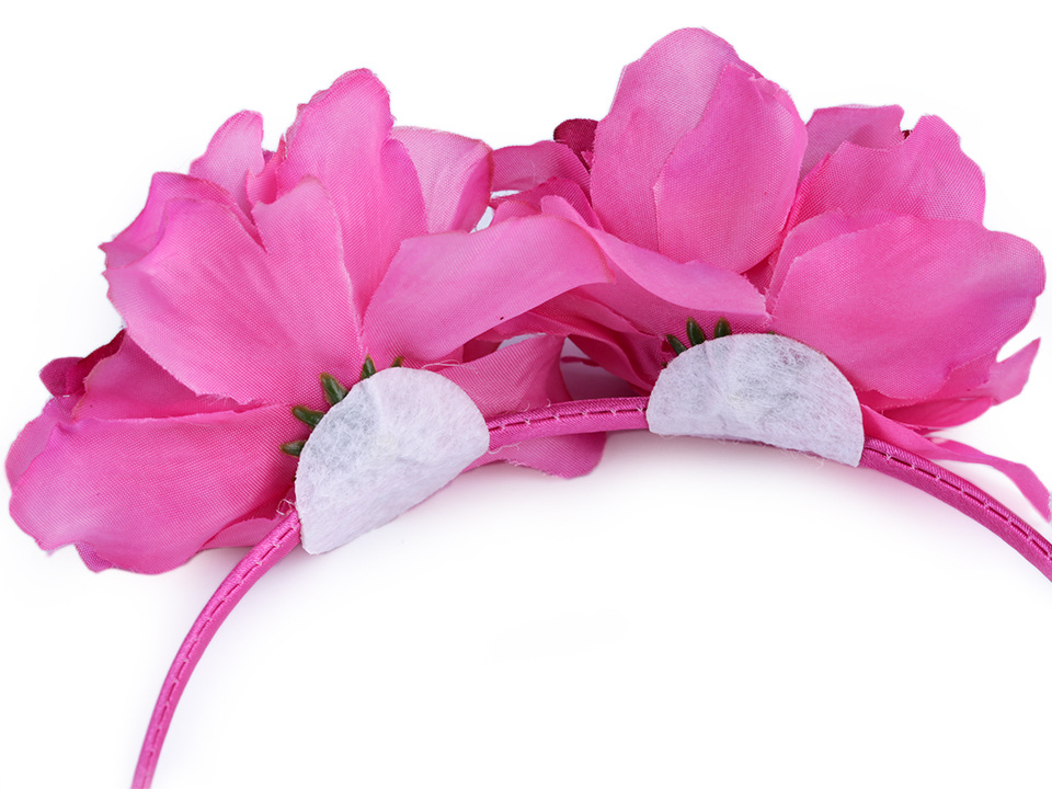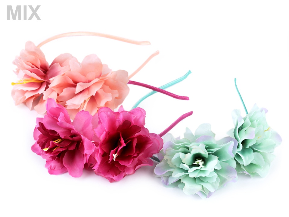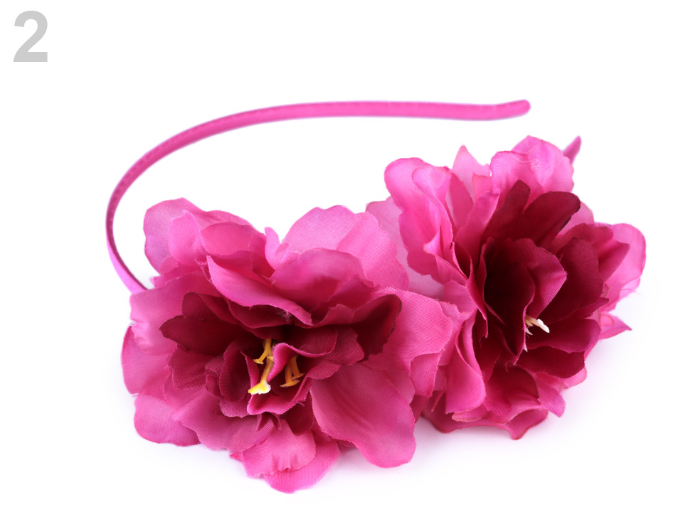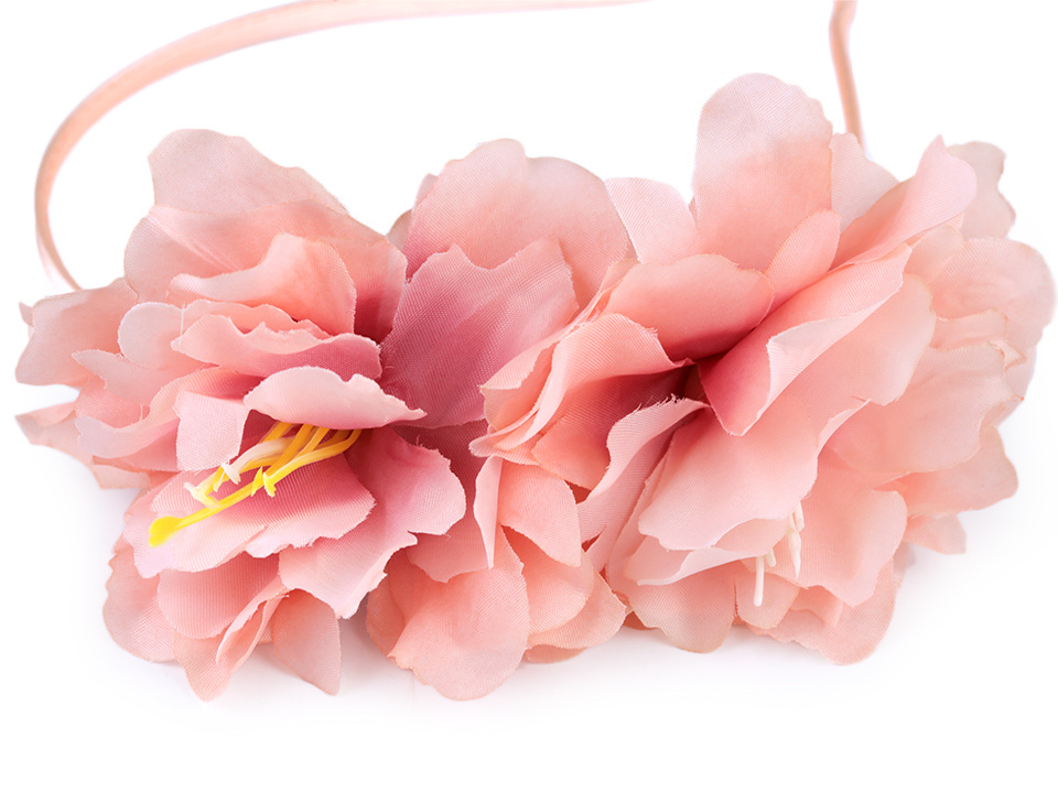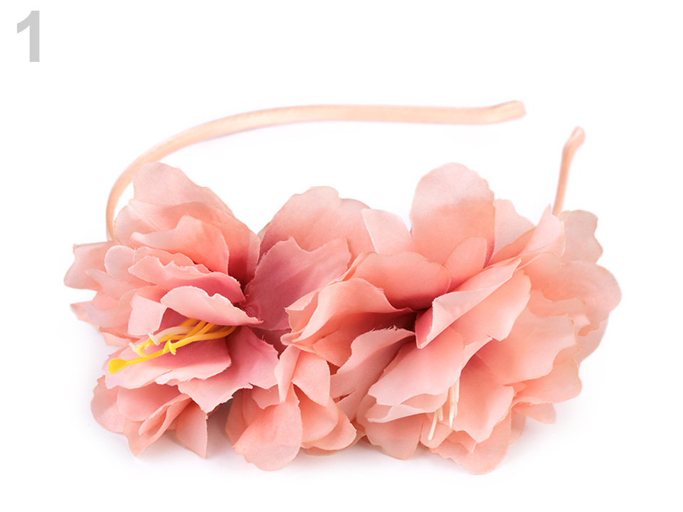 Na kovovém základu, který je celý potažený saténem, jsou pevně připevněné polyesterové květy s pestíky. Květy jsou barevně tónované, působí přirozeným dojmem.